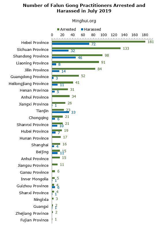 Prema podacima pristiglim na Minghui.org, u Kini su u julu mjesecu 2019. godine uhapšena 922 praktikanta Falun Gonga, a njih 289 je maltretirano zbog njihove vjere.
