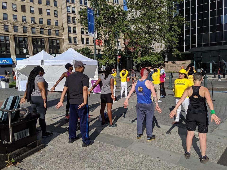 Falun Dafa praktikanti bili su bili pozvani da učestvuju u New York City Summer Streets manifestaciji i da dva vikenda zaredom podučavaju ljude vježbama na trgu Foley u blizini Civic Center (Građanskog centra) i Gradske vijećnice.