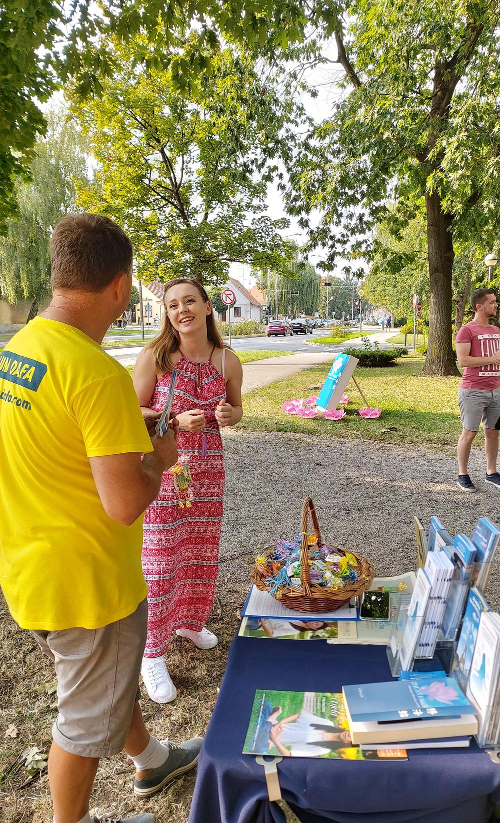 Nakon što su praktikanti objasnili istinu o Falun Dafa i o progonu u Kini paru iz Italije, oni su uzeli višejezične brošure i raspitivali se o lokalnim mjestima za vježbanje u Italiji.