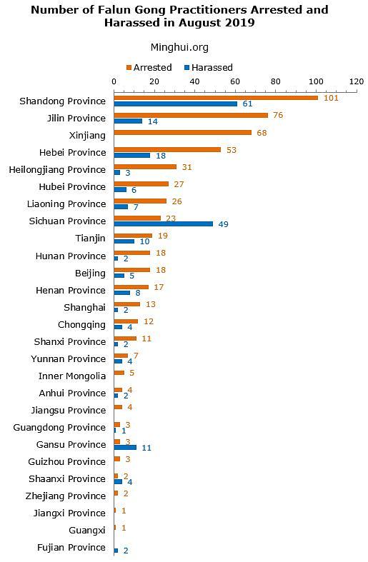 Prema informacijama koje je prikupio Minghui.org, 636 praktikanta Falun Gonga je uhapšeno u Kini u septembru mjesecu 2019. godine zbog odbijanja da se odreknu svoje vjere. Kod 251 praktikanta pogođenog progonom je izvršen pretres domova, a najmanje je njih 500 ostalo u pritvoru u vrijeme pisanja ovog izvještaja.
