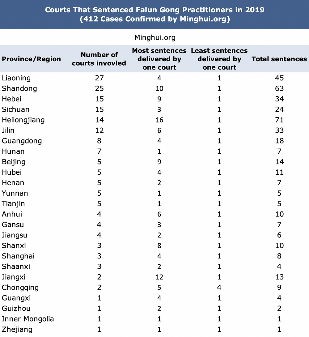 Tačnije, potvrđeno je da je ukupno 177 sudova u 25 provincija i opština osudilo 412 praktikanata, što ukazuje na široku uključenost pravosudnog sistema u Kini, uključujući sudove na nivou distrikta, gradskog, okružnog i velegradskog nivoa. Drugostepeni sudovi u provincijama Yunnan, Sichuan i Shandong su bili odgovorni za pet slučajeva.