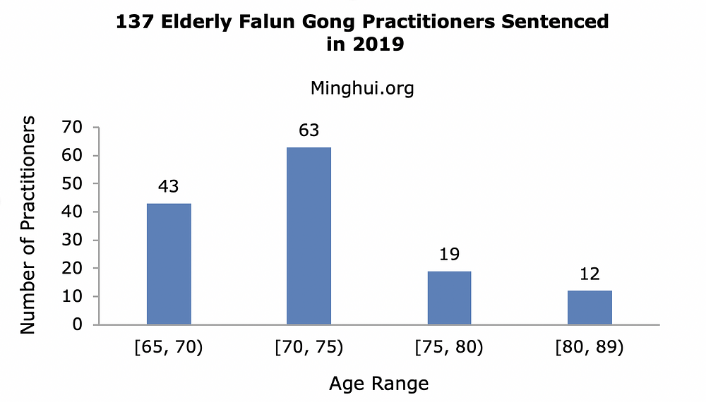 Ni stariji praktikanti nisu bili pošteđeni. Gospođa Zhang Xinwei, stara 89 godina, stanovnica grada Bazhonga u provinciji Sehuan, je dobila kaznu od tri godine. Gospodin Guo Yunian, star 85 godina, iz grada Jilina u provinciji Jilin, je osuđen na šest godina. Još je 135 praktikanata starijih od 65 godina također osuđeno u 2019. godini.