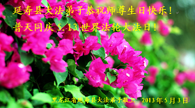 Praktikanti u sledećim distriktima i okruzima u Harbinu slave Svetski dan Falun Dafe i 21. godišnjicu predstavljanja Dafe javnosti, i s poštovanjem žele milostivom Učitelju srećan rođendanan!