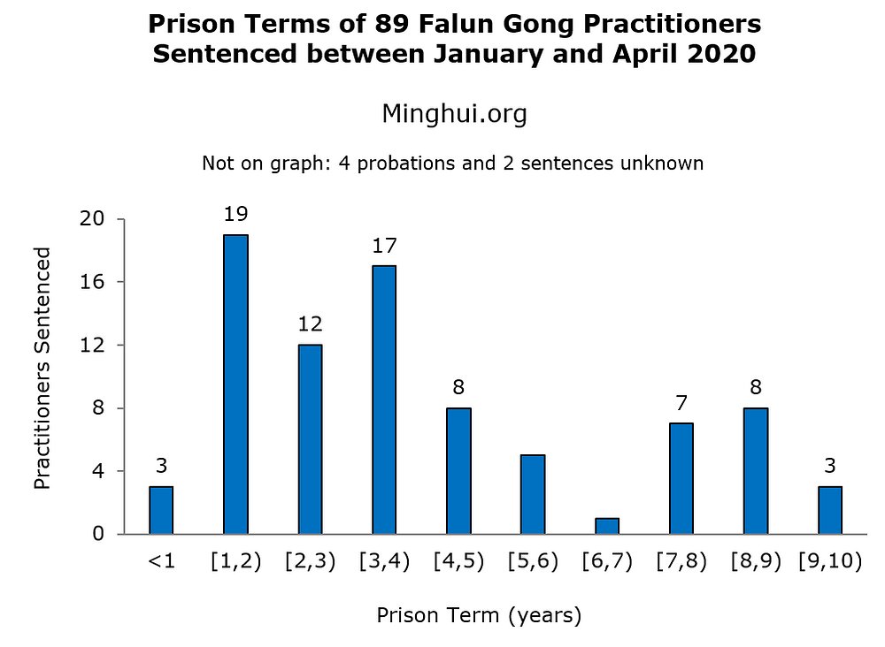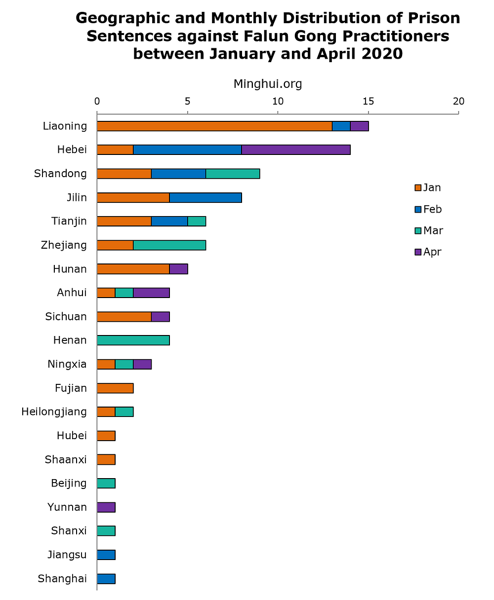 U mjesecu aprilu 2020. godine osuđeno je još 13 Falun Gong praktikanata zbog njihove vjere, čime je broj praktikanata osuđenih u ovoj godini dostigao cifru od 89, uključujući 41 u januaru, 18 u februaru i 17 u martu.