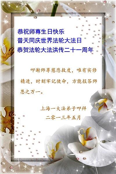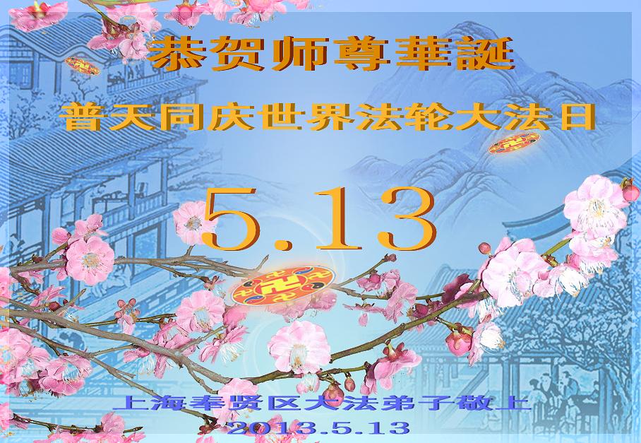 Praktikanti iz sljedećih distrikta i okruga u Šangaju slave Svjetski Falun Dafa dan i 21. obljetnicu predstavljanja Falun Dafa u javnosti! S poštovanjem žele milostivom velikom Učitelju sretan rođendan!