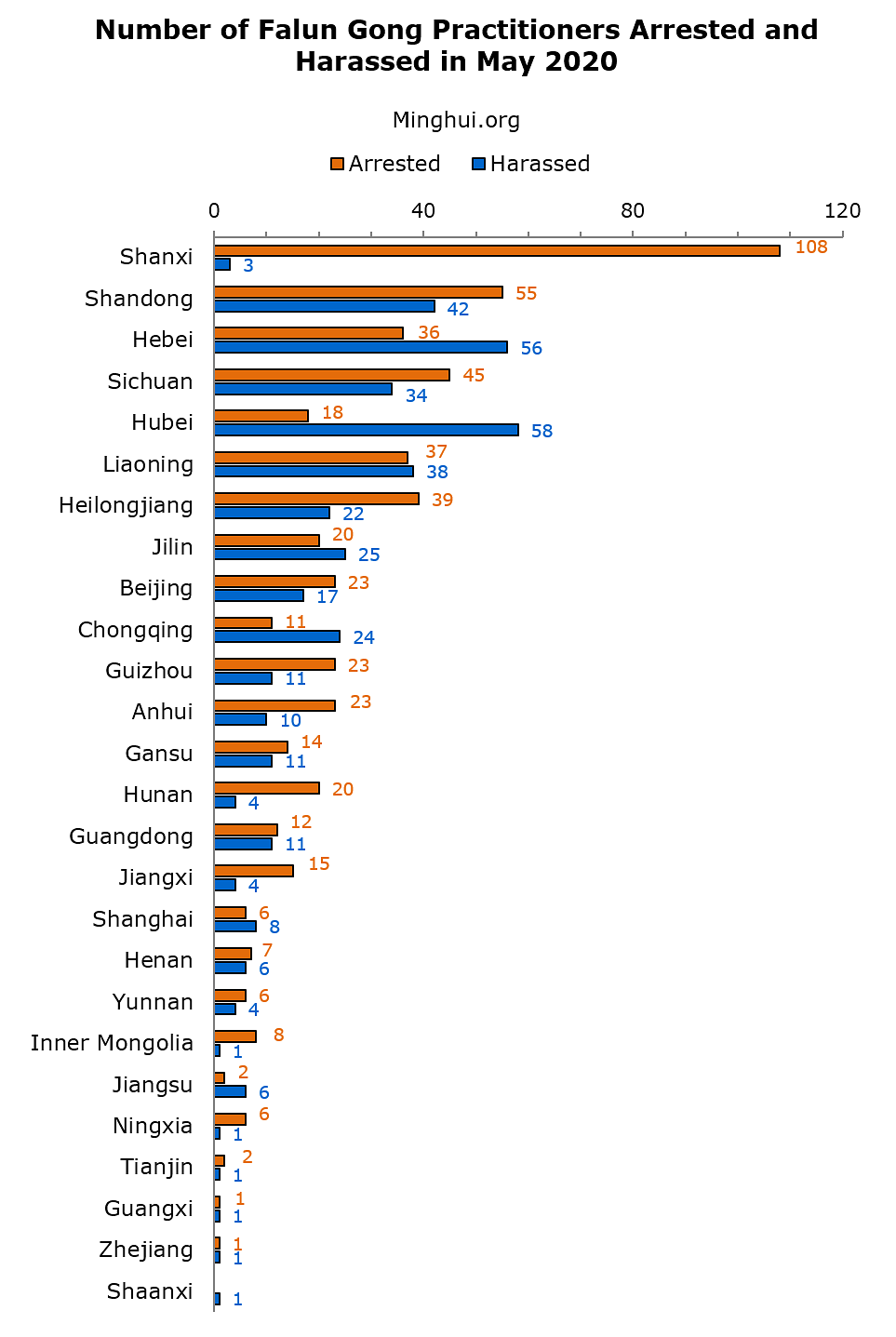 Slučajevi hapšenja i uznemiravanja u maju mjesecu su se dogodili u 26 provincija i opština. U provincijama Shanxi, Shandong, Hebei, Sichuan i Hubei je bilo najviše slučajeva hapšenja i uznemiravanja.