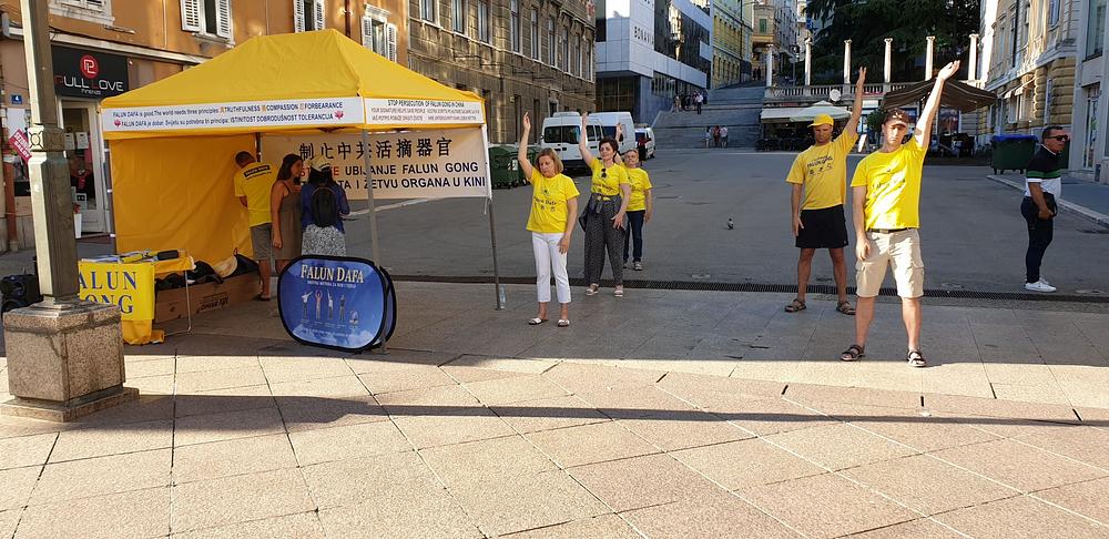 Falun Dafa praktikanti iz Hrvatske i Slovenije održali su 8. srpnja 2020. godine predstavljanje Falun Dafa (naziva se i Falun Gong) u Rijeci, primorskom gradu na sjevernom Jadranu. Događaj je održan u centru grada, na popularnoj šetnici Korzo. Praktikanti su postavili šator i stol s informativnim materijalima, posterima, letcima i Falun Dafa knjigama. Polovica praktikanata je izvodila vježbe, dok je druga polovica dijelila letke i objašnjavala zainteresiranim prolaznicima što je Falun Dafa, odakle potječe, zašto je progonjen u Kini te je informirala ljude o tekućoj žetvi organa od živih Falun Dafa praktikanata u Kini.