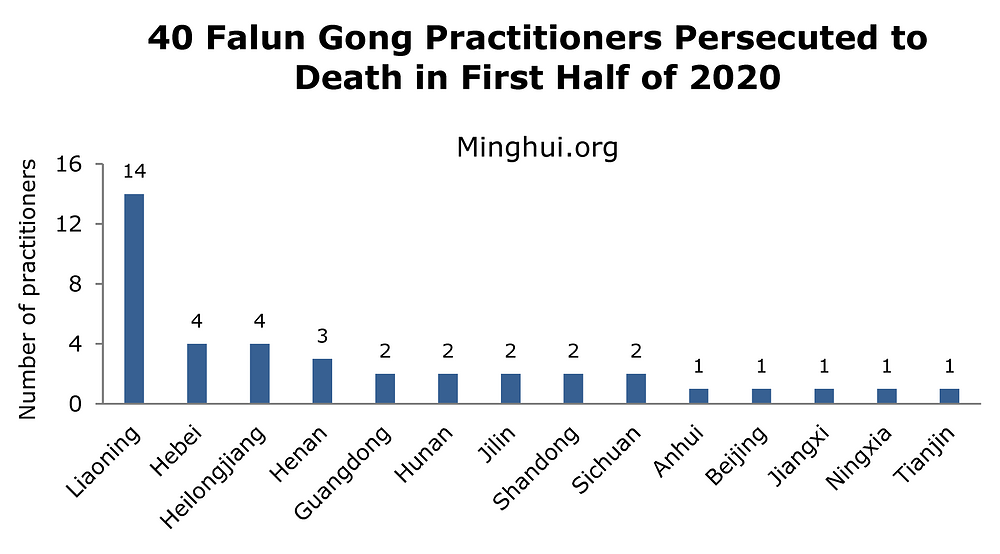 Ovih 40 novonastradalih praktikanata, od kojih su 22 žene, dolaze iz 14 pokrajina i općina pod centralnom kontrolom. Samo u provinciji Liaoning ima 35% smrtnih slučajeva (14), dok su ostale regije imale između 1 i 4 slučaja. Šesnaest praktikanata je umro tokom pritvora, uključujući 6 u Liaoningu (37,5%).