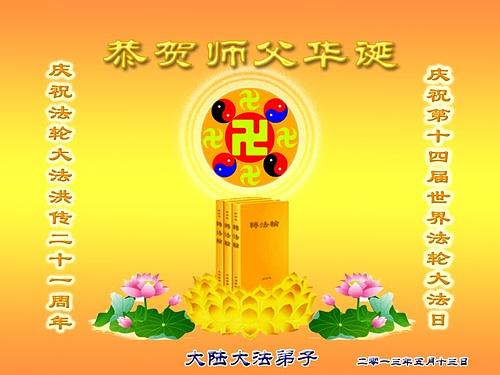 Praktikanti iz sljedećih područja u Kini slave Svjetski Falun Dafa dan, 21. obljetnicu predstavljanja Falun Dafa u javnosti i šalju rođendanske čestitke Učitelju Li Hongzhiju.