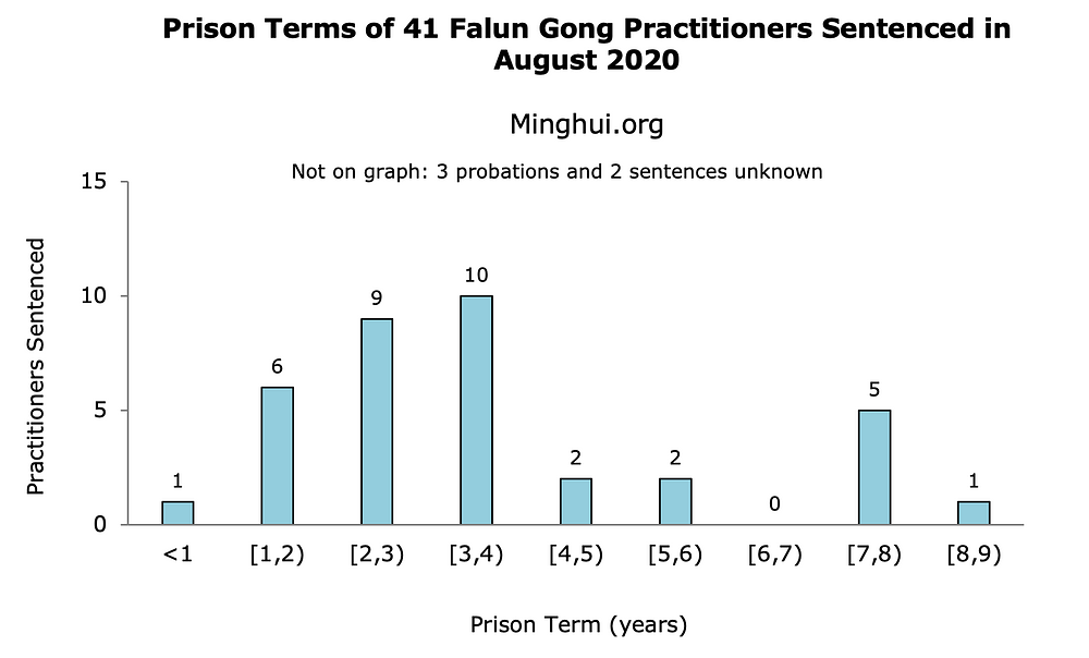 Prema informacijama dostavljenim na Minghui.org, u mjesecu avgustu 2020. godine 41 praktikant Falun Gonga je u Kini osuđen na zatvorske kazne zbog svoje vjere.