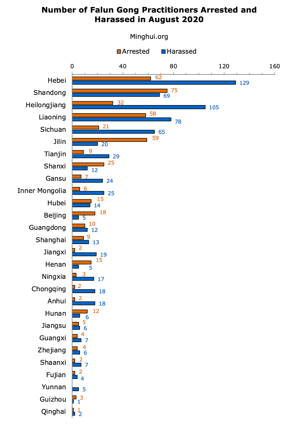 Prema podacima prikupljenim na web stranici Minghui.org, u avgustu mjesecu 2020. godine 463 su praktikanta Falun Gonga uhapšena, a 721 je bio maltretiran zbog svoje vjere. 292 praktikant se i dalje nalaze u pritvoru u vrijeme pisanja ovog članka.