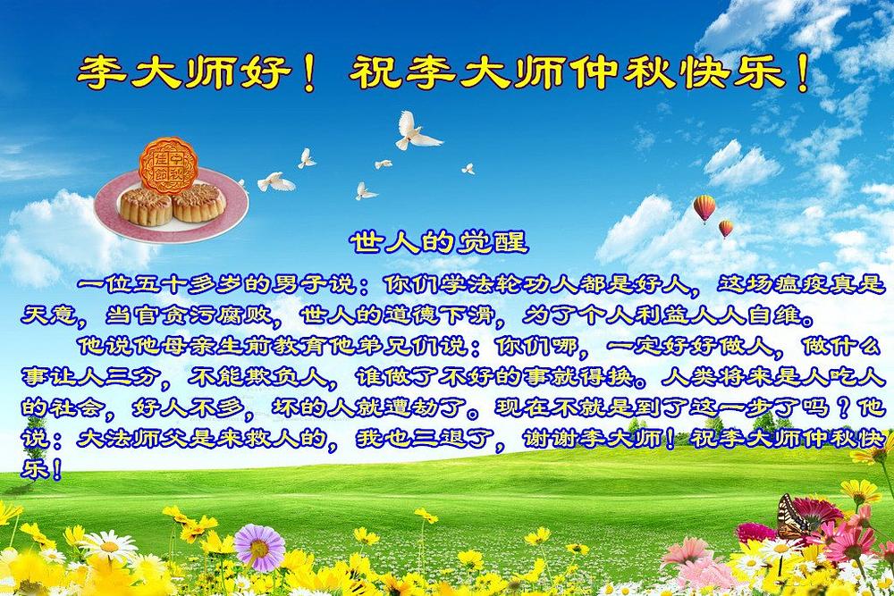 „Jesenji festival je simbol ponovnog okupljanja. Osjećamo da će vrijeme, u kojem ćemo se ponovo sresti, doći uskoro. Želimo vam sretan Praznik mjeseca!“ Ova pozdravna poruka upućena Učitelju Li Hongzhiju, osnivaču Falun Gonga (koji se naziva i Falun Dafa), od ljudi iz okruga Pingshan, provincija Hebei, prenosi zapravo iskrene osjećaje stotina miliona ljudi u Kini.