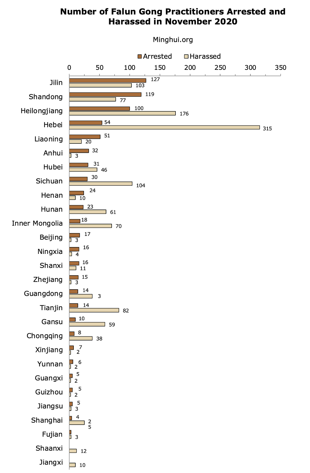 Jilin, Shandong, Heilongjiang, Hebei i Liaoning su bile pet provincija s najviše uhapšenih praktikanata. U proteklih mjesec dana u provinciji Hebei je maltretirano tri stotine i petnaest praktikanata, a 176 njih u provinciji Heilongjiang.