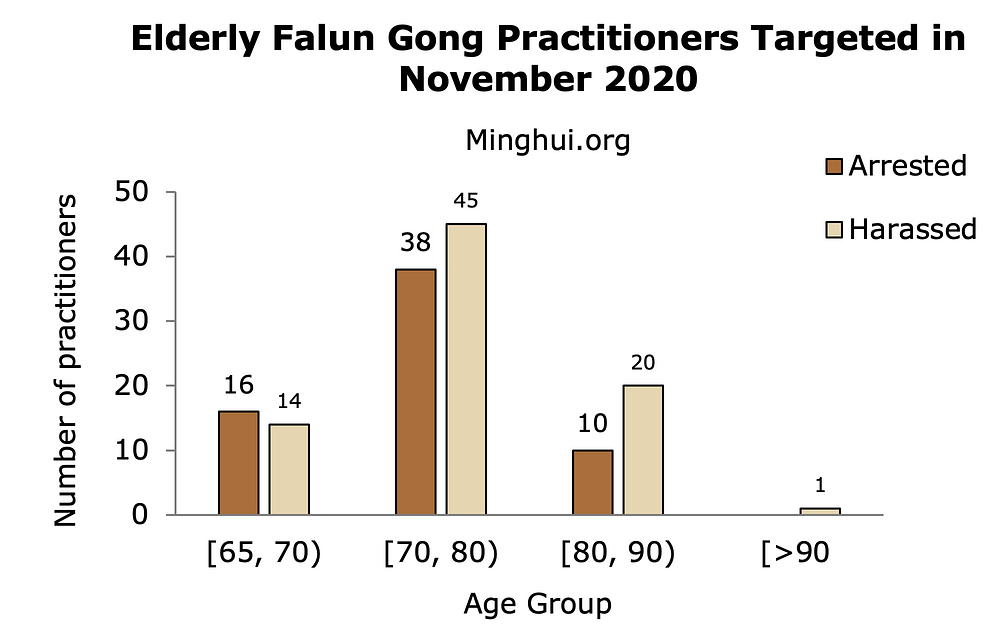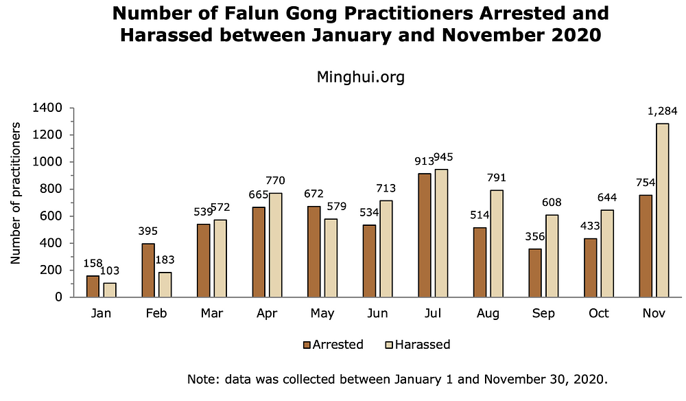 U novembru mjesecu 2020. godine, uhapšeno je najmanje 754 praktikanta Falun Gonga, a njih 1.284 je maltretirano zbog svoje vjere. Ovogodišnji zbir hapšenja i maltretiranja sa današnjim danom iznosi 5.933, odnosno 7.192 slučajeva.