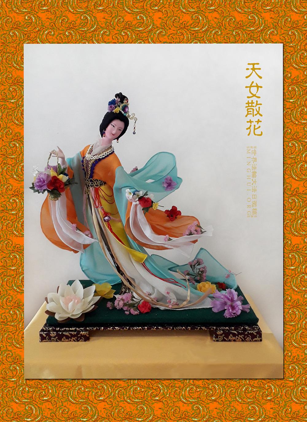 Ovu svilenu figuricu, nazvanu "Nebeska djevojka prosipa cvijeće", izradio je Falun Dafa praktikant iz Španjolske. Drevni Kinezi vjerovali su, da kad božansko biće dođe na svijet da spasi ljude, nebeske će djevojke bacati cvijeće uokolo u čast velikog događaja.