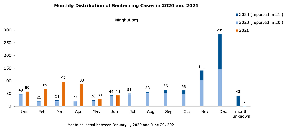 Novo evidentirani slučajevi uključuju i 7 slučajeva iz 2019. godine, 271 slučaj iz 2020. godine i 389 slučajeva u 2021. godini, tako da ukupan broj potvrđenih slučajeva izrečenih kazni u 2019. godini iznosi 781, a u 2020. godini 893. Ovo kašnjenje u prijavljivanju slučajeva rezultat je prvenstveno stroge cenzure informacija u Kini, što otežava dopisnicima Minghuija pravovremeno prikupljanje, provjeru i slanje informacija.