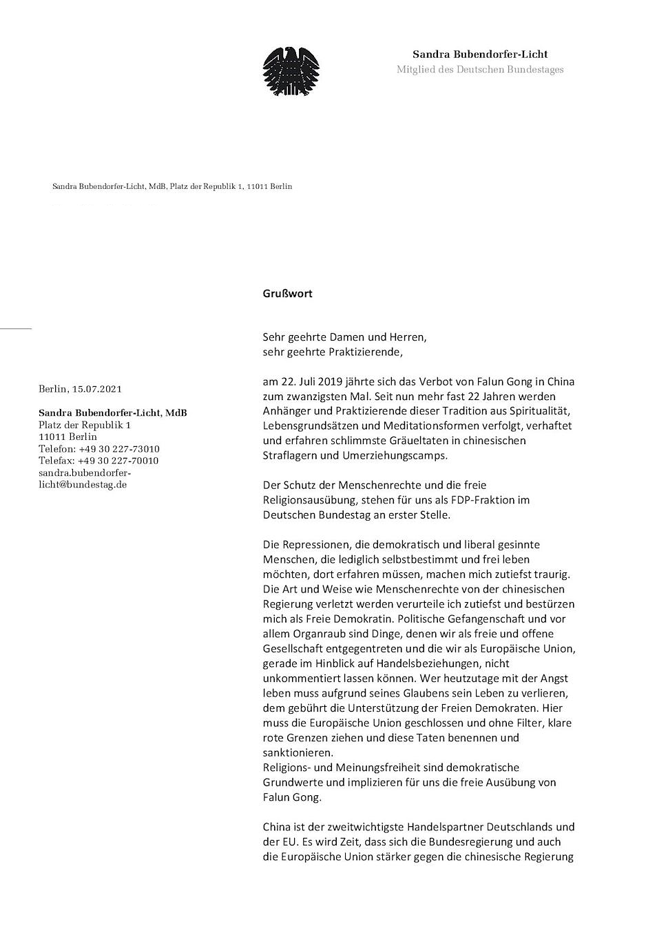 "Mi liberalni demokrati ćemo nastavit posvećivati svu svoju energiju zaštiti ljudskih prava u cijelom svijetu i suprotstavit ćemo se svim organizacijama i zemljama koje krše demokratske vrijednosti ili ljudska prava", napisala je Bubendorfer-Licht. “Moje srce je uz ljude koji su progonjeni u Kini. Moje kolege u Radnoj grupi za ljudska prava Liberalno demokratske partije njemačkog parlamenta i ja vrijedno ćemo raditi na slobodi i pravima Falun Gonga.”