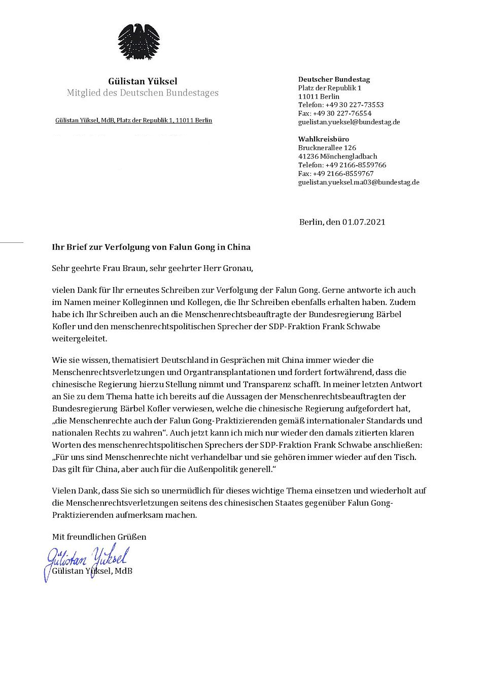 Gülistan Yüksel, članica parlamenta ispred SPD, je kazala da je njemačka vlada u više navrata pokretala pitanje kršenja ljudskih prava i prisilne žetve ljudskih organa tokom razgovora s Kinom. Konkretno, Bärbel Kofler iz Komiteta za ljudska prava i humanitarnu pomoć je izdala saoštenje u kojem poziva KPK da osigura ljudska prava Falun Gong praktikanata kao i drugih građana.