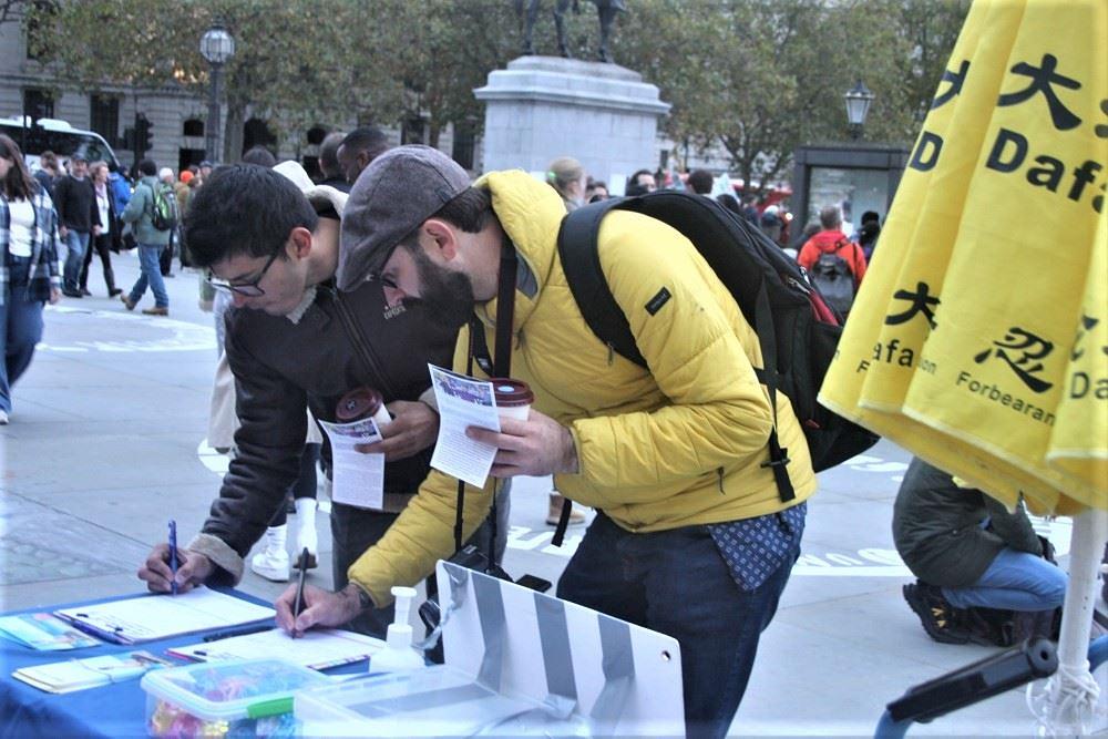 Falun Dafa praktikanti nastavili su aktivnosti za podizanje svijesti na slikovitim mjestima, nakon što su ograničenja zbog pandemije ukinuta u srpnju. Održavali su aktivnosti u kineskoj četvrti, ispred Britanskog muzeja i na Trgu sv. Martina svake subote poslijepodne. Ljudi su prihvaćali letke i potpisivali peticiju za osudu progona kojeg provodi Komunistička partija Kine (KPK).