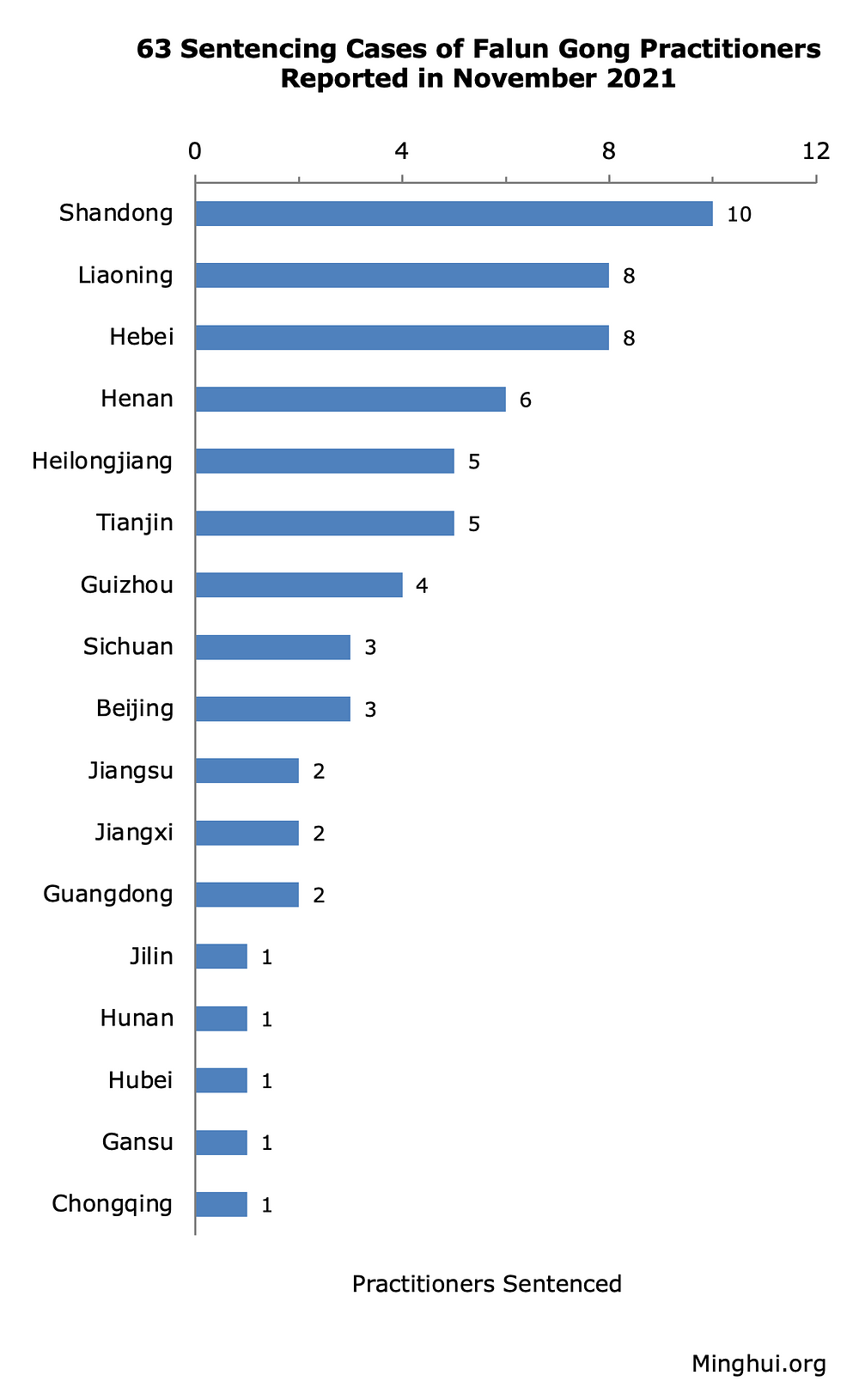 Osuđeni praktikanti su iz 33 grada u 17 pokrajina i opština. Shandong (10), Hebei (8), Liaoning (8) su prve tri regije sa najviše slučajeva. Preostalih 14 regija prijavilo je između jednog i pet slučajeva.