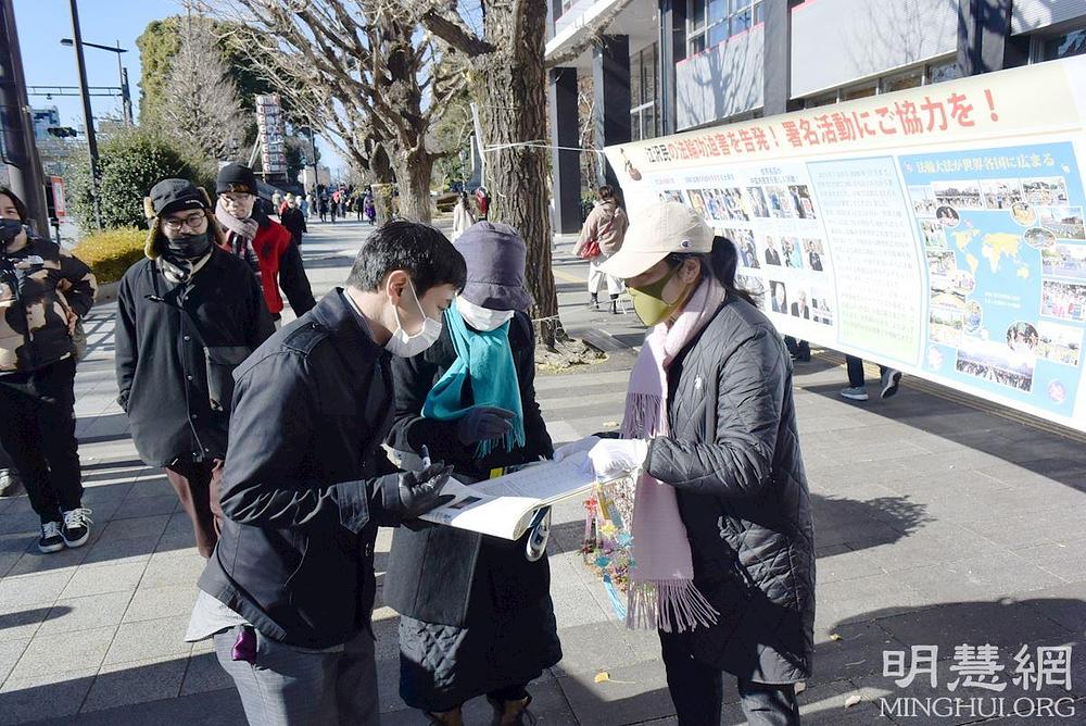 U skladu sa japanskom tradicijom, mnogi ljudi na Novu godinu idu u hramove ili svetišta kako bi se pomolili. Praktikanti su im prvo pristojno poželjeli sretnu Novu godinu i ponudili informacije o Falun Dafa i o progonu koji je u toku Kini. Nakon što bi razgovarali s praktikantima i pročitali informativne materijala, mnogi su se odlučili da potpišu peticiju da bi podržali kaznenu prijavu protiv bivšeg čelnika Komunističke Partije Kine (KPK) Jianga Zemina zbog progona Falun Dafa.