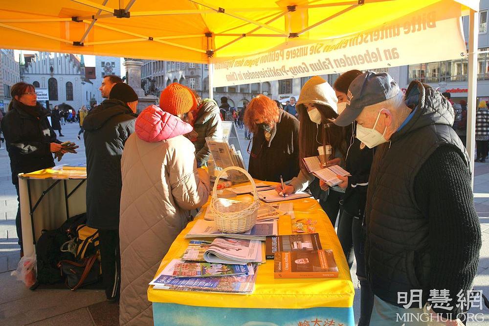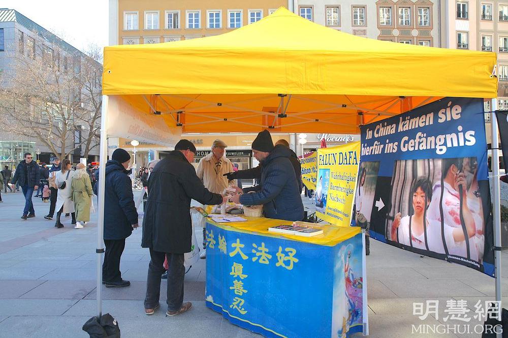 Čak i usred zime, Falun Dafa praktikanti svakog tjedna i dalje održavaju informativne aktivnosti u središtu Münchena. Predstavljaju ovu duhovnu praksu javnosti i razotkrivaju progon koji nad Falun Dafa vrši Komunistička partije Kine (KPK), a koji traje već skoro 23 godine. Prolaznici se na taj način informiraju o Falun Dafa i potpisuju peticiju kojom se poziva na okončanje KPK-ovih eklatantnih kršenja ljudskih prava.