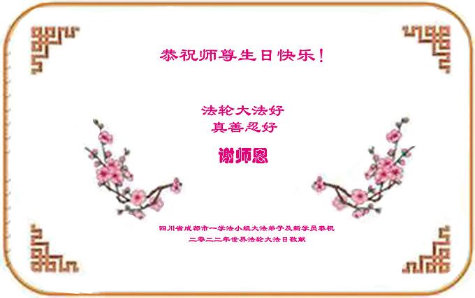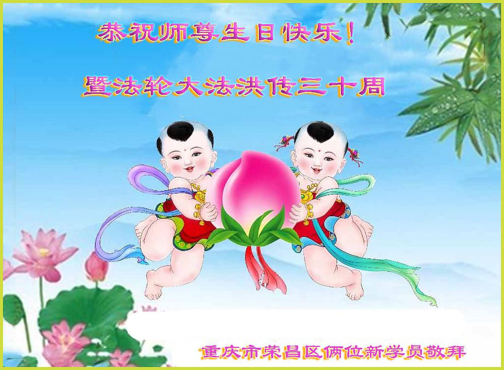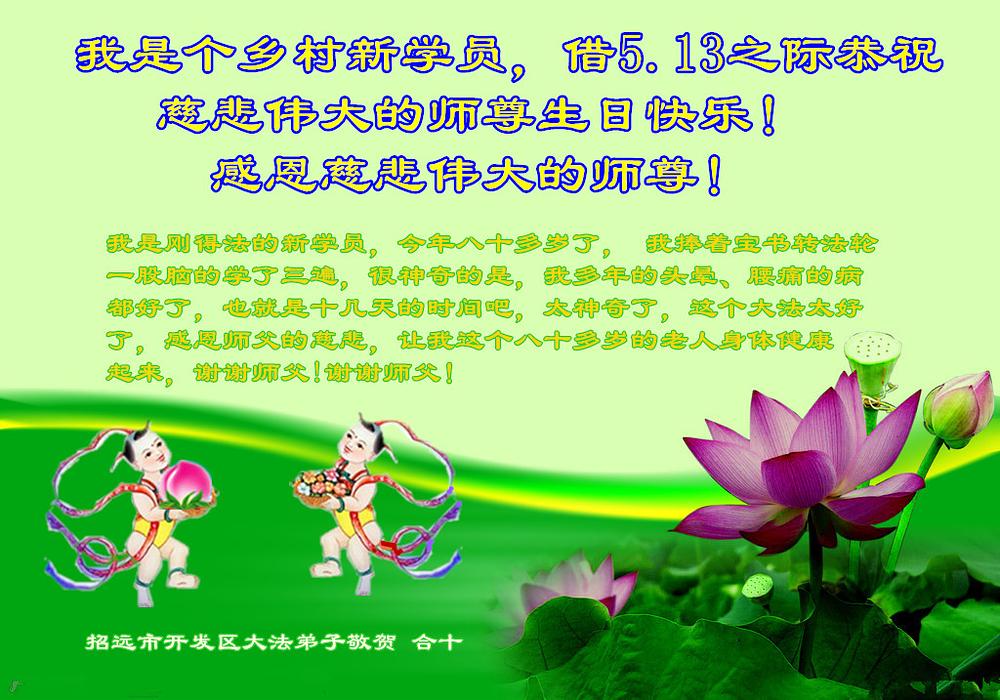 S obzirom da se 13. svibnja ove godine obilježava 30. godišnjica predstavljanja Falun Dafa javnosti, novi praktikanti, različitih dobnih skupina i iz raznih provincija u Kini, šalju svoje pozdrave kako bi Učitelju Li Hongzhiju, osnivaču Falun Dafa, čestitali rođendan.