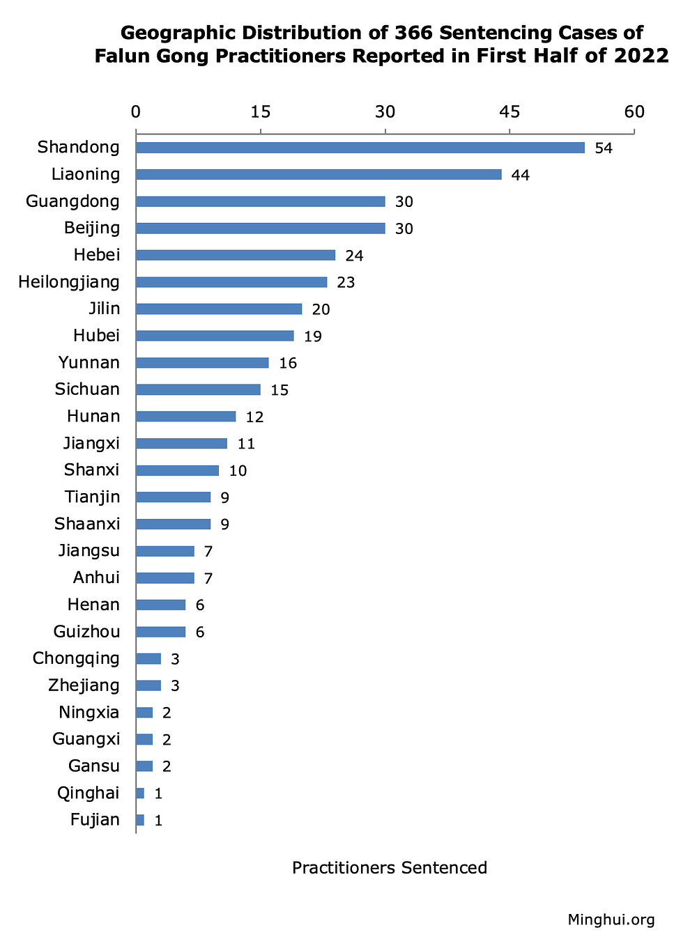 Ovih 366 krivo osuđenih praktikanata dolaze iz 26 provincija i opština. Provincija Shandong je bila na vrhu liste s 54 slučaja izricanja kazne, a slijede 44 u Liaoningu, 30 u Pekingu, 30 u Guangdongu i 24 u Hebeiju. Osam drugih regija je prijavilo dvocifrene slučajeve, a preostalih 13 regija imalo je jednocifreni broj slučajeva. Praktikanti su bili iz svih sfera života, uključujući učitelje, ljekare, inžinjere i računovođe. Nekoliko bivših policajaca također su se našli na meti napada zbog prakticiranja Falun Gonga.