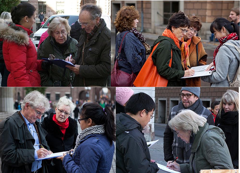 Falun Gong praktikanti u Švedskoj su 26. listopada 2013.g. organizirali potpisivanje peticije na Mynttorget trgu, u blizini kraljevske palače u Stockholmu, kako bi se osudio 14 godina dug progon Falun Gonga od strane Komunističke partije Kine (KPK). Praktikanti su također objašnjavali istinu prolaznicima i pokazivali pet Dafa vježbi.