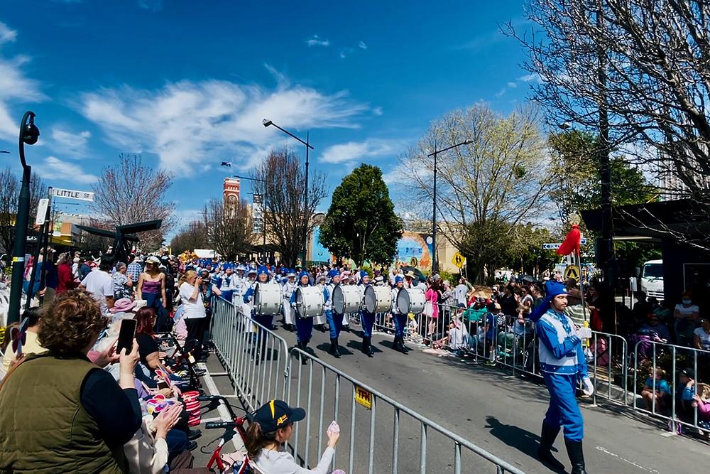Nastupili su Tian Guo Marching Band, tim koji izvodi ples zmajeva i dobošarska grupa. Mnogi gledaoci su rekli kako su bili impresionirani energijom praktikanata i da su uzbudljive melodije poput „Falun Dafa je dobar” odjekivale u njima. Odjeveni u kostime različitih kineskih etničkih grupa, mladi praktikanti su nosili transparente s natpisima „Falun Dafa je dobar“ i „Našem svijetu je potrebna Istinitost-Dobrodušnost-Tolerancija“.