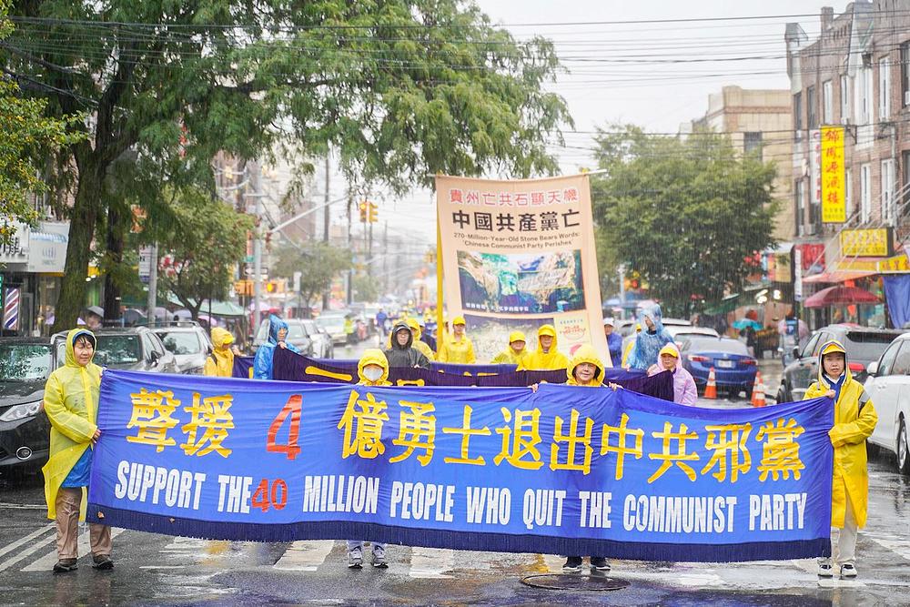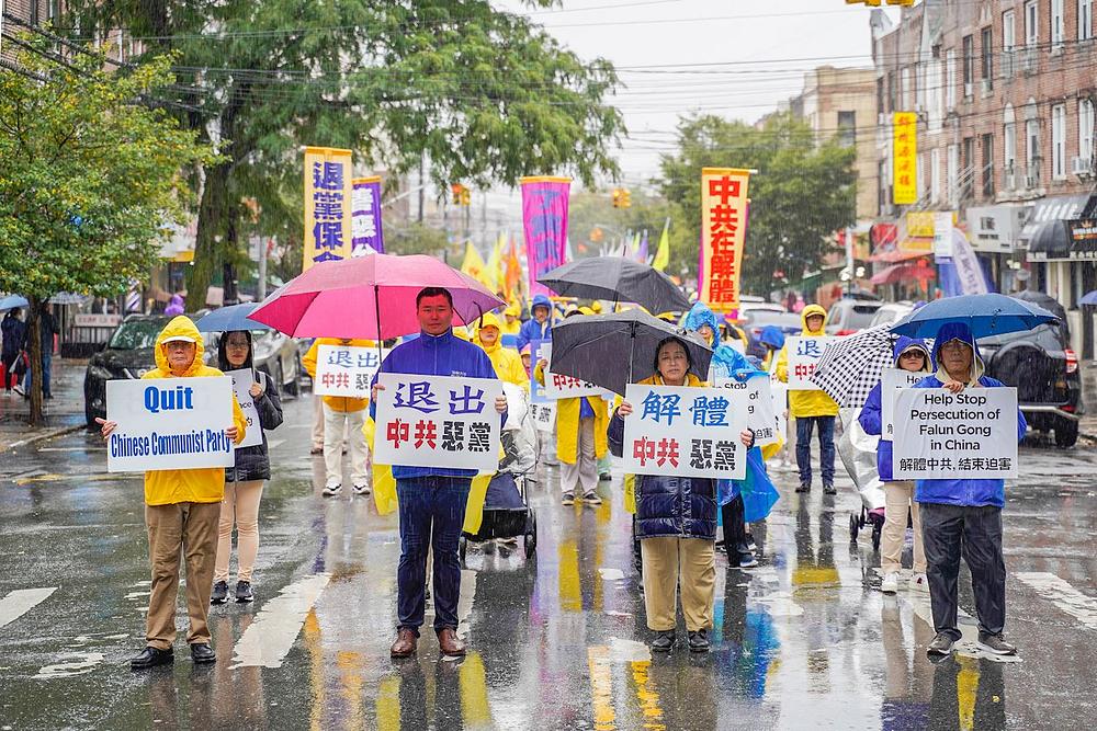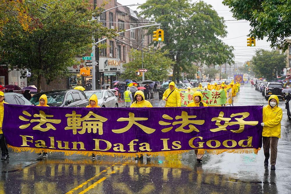 Zastave i transparenti su, 2. oktobra 2022. godine, ispunili 8. aveniju u Bruooklynu u New Yorku, a okolne zgrade su odjekivale od zvukova gongova i bubnjeva. Više je od 1.000 Falun Dafa praktikanata održalo veliku paradu po kiši kako bi ljude upoznali sa dvadeset trogodišnjim progonom njihove miroljubive kultivacijske prakse u Kini. Parada je održana i kako bi se odalo priznanje za 400 miliona Kineza koji su napustili Komunističku partiju Kine (KPK) i njene pridružene organizacije. Mnogi prolaznici su se zaustavljali da gledaju paradu i dobiju informacije o brutalnom progonu.