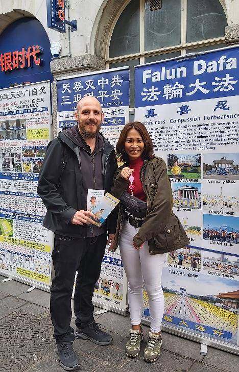 Mark i njegova kineska prijateljica Wendy su toga popodneva naišli pored plakata. Mark je kazao da je prije mnogo godina pročitao kako KPK na metu uzima Falun Dafa praktikante u žetvi organa. „KPK ne poštuje život i ne mari za ljude,” rekao je. „Hvala vam što i dalje govorite u ime ovih nevinih ljudi. To je veoma važno.” Wendy je rekla da također cijeni vrijednosti Istinitosti-Dobrodušnosti-Tolerancije.
