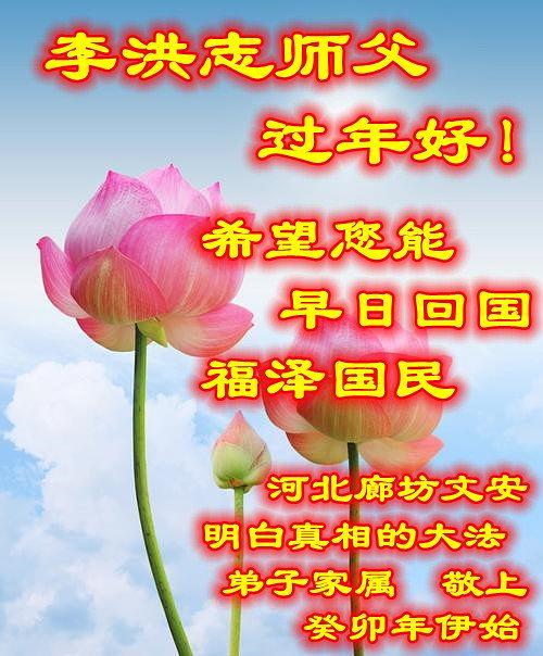 Članovi porodica praktikanata iz grada Tangshana, provincija Hebei, su kazali da učenja Falun Dafe ne samo da uče praktikante da budu bolji građani, već i da daju nadu ljudima. „Hvala Učitelju Liju što je našoj porodici pružio miran život u proteklih nekoliko godina“, piše u čestitci.