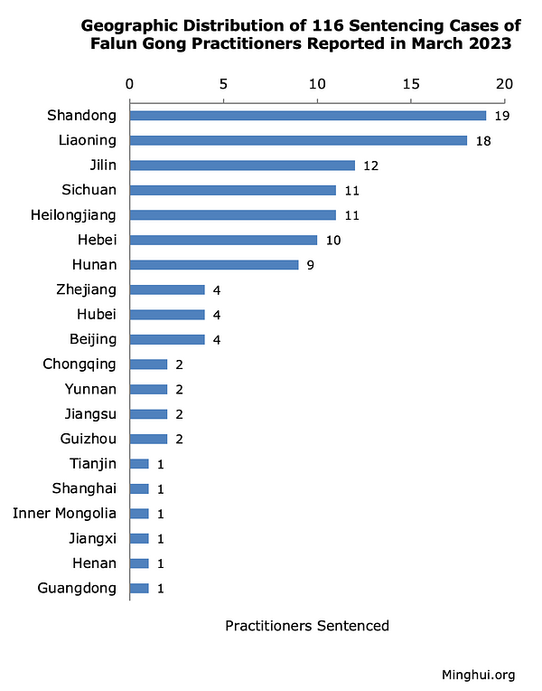 U martu mjesecu 2023. godine prijavljeno je ukupno 116 slučajeva Falun Gong praktikanata osuđenih zbog svoje vjere.