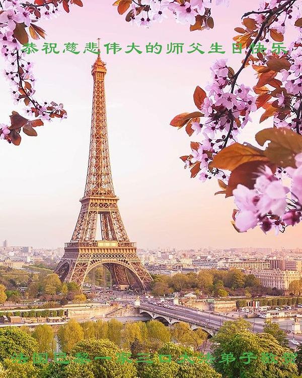 Falun Dafa praktikanti iz Pariza u Francuskoj slave Svjetski Falun Dafa Dan i žele poštovanom Učitelju sretan rođendan!