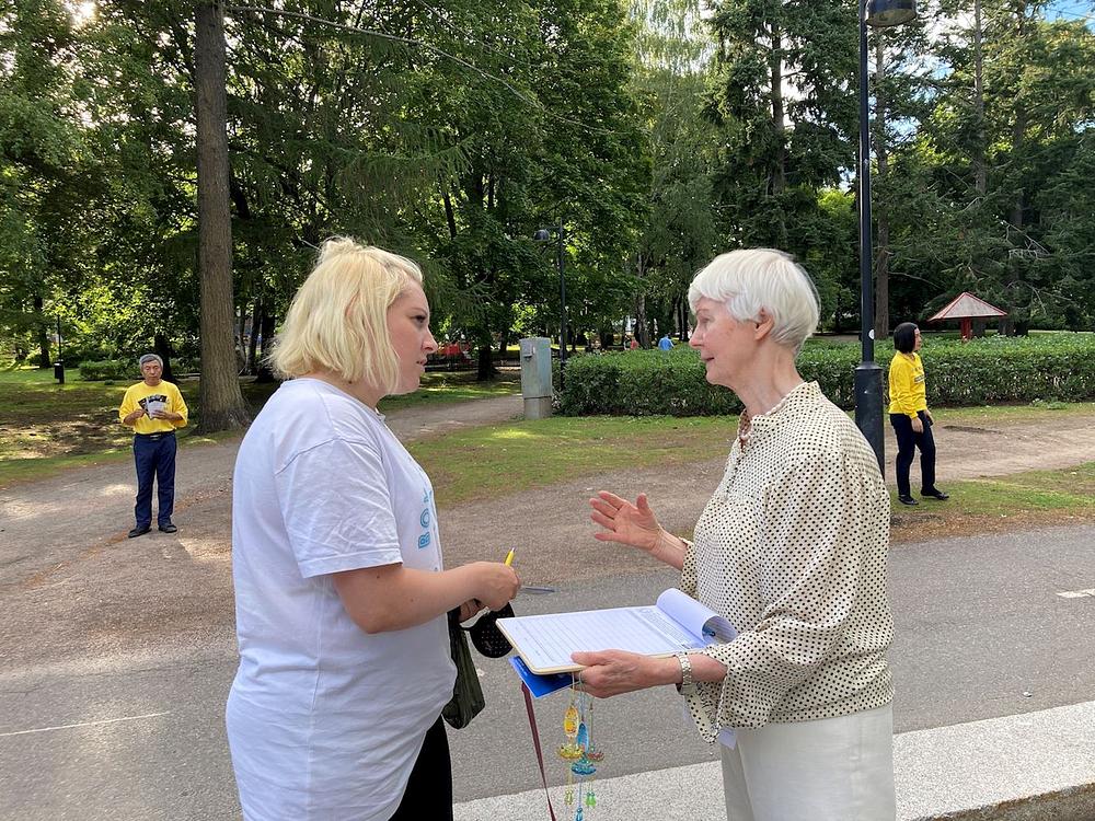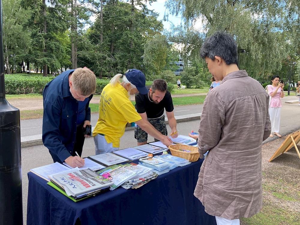Jedna Finkinja i njena dva prijatelja iz SAD-a i Holandije slučajno su naišli pored izložbe plakata. Žena je rekla da je žetva organa od živih ljudi užasna, ali nije bila iznenađena što KPK čini takav zločin. Sve troje su potpisali peticiju i poželjeli da praktikanti dobiju više potpisa i pažnje javnosti.