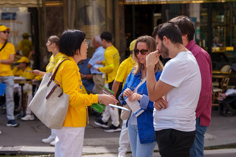 Dva su nastavnika prolazila trgom Place de la République, kada su ugledali događaj i zastali da saznaju više. Praktikant im je objasnio šta je Falun Dafa, da se prakticira u preko 100 zemalja, a zatim im je govorio o progonu u Kini. Oba su nastavnika potpisala peticiju podrške naporima praktikanata da okončaju progon. Pošto su u Kini bili prije 20 godina, nastavnici su upoznati da tamo nema slobode vjerovanja i kazali da se nadaju da će se situacija promijeniti.