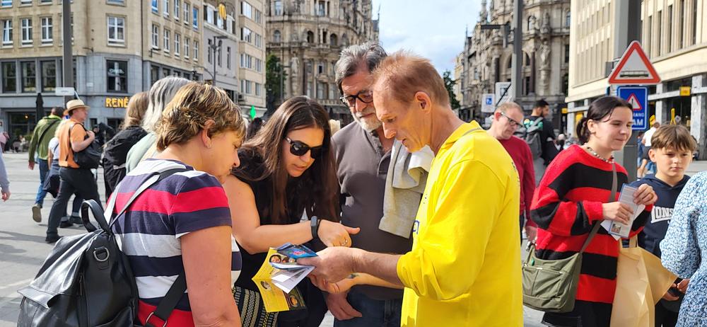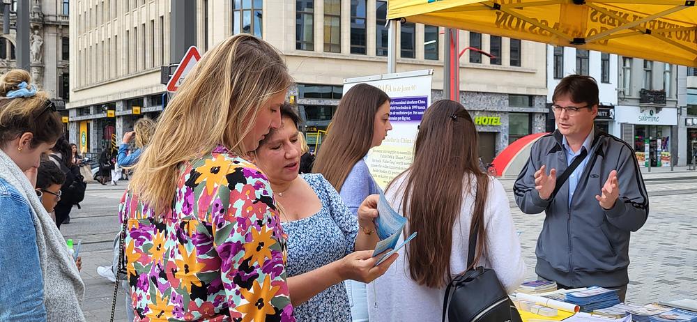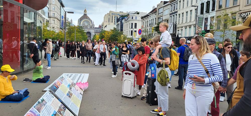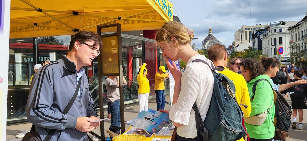 Praktikanti su održali informativne aktivnosti u Antwerpenu 30. septembra 2023., predstavljajući Falun Dafa. Tijekom aktivnosti praktikanti su također informirali posjetitelje o progonu prakse u Kini. Mnogi prolaznici su gledali demonstraciju vježbi i poželjeli saznati više. Jedan prolaznik po imenu Len je rekao: „Trebali bismo prenijeti poruku ljubaznosti. Principi Istinitosti-Dobrodušnosti-Tolerancije su sjajni!”