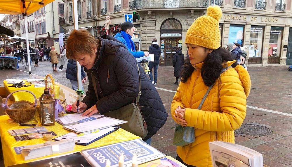 Božićni sajam u Strasbourgu jedan je od najstarijih božićnih sajmova u Europi, a svake ga godine posjeti dva milijuna ljudi. Budući da je uskoro Božić, posjetitelji su bili mnogobrojni. Mnogi su ljudi bili šokirani žetvom organa koju provodi KPK, od živih Falun Dafa praktikanata, te su potpisivali peticiju kojom pozivaju na zaustavljanje brutalnosti. Neki ljudi su im rekli: „Radite dobar posao i vrlo ste hrabri. Molim vas, nastavite marljivo raditi!” Neki su ljudi bili zainteresirani za prakticiranje Falun Dafa, te su na licu mjesta naučili pet vježbi.
