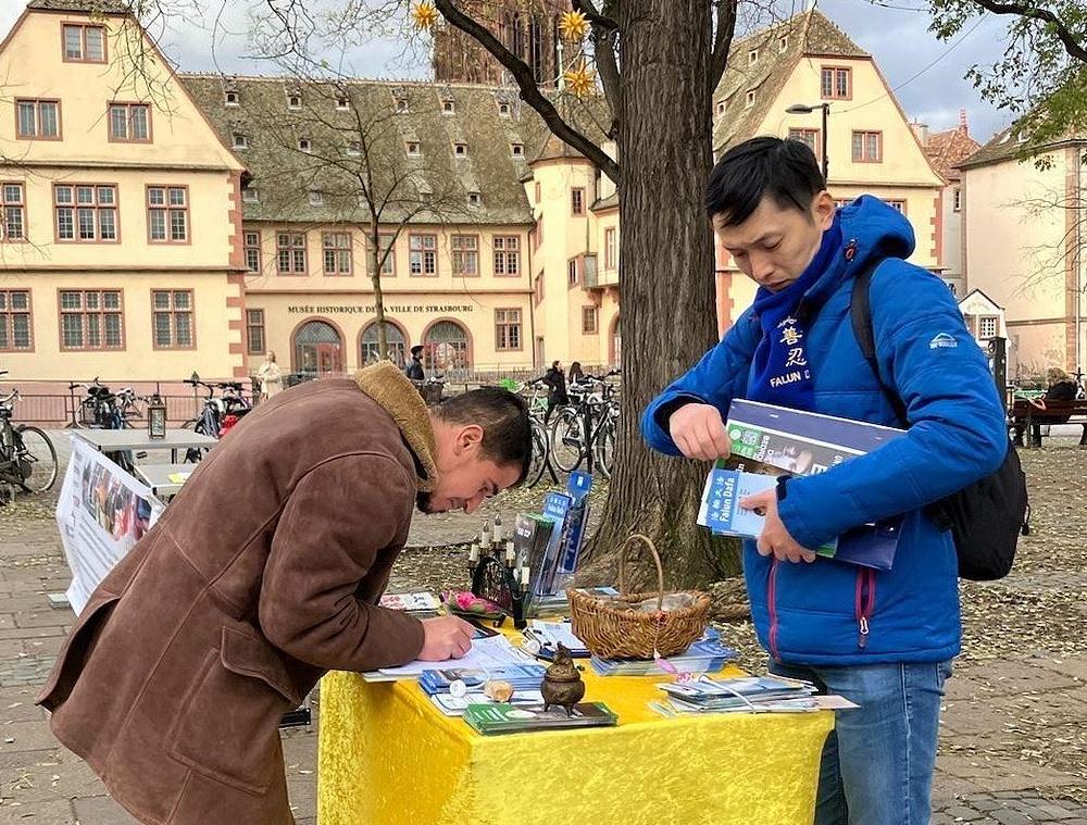 Praktikanti su održali aktivnosti u Strasbourgu u istočnoj Francuskoj kako bi predstavili Falun Dafa, 9. i 10. prosinca 2023. Postavili su štandove na Place d' Austerlitz u blizini ulaza na božićni sajam, kod željezničkog kolodvora Place de la Gare i na trgu Place du Corbeau te podizali svijest o progonu Falun Dafa (poznatog i kao Falun Gong) od strane Komunističke partije Kine (KPK). Tijekom ovog događaja također su prikazivali Falun Dafa vježbe i svirali kineske bubnjeve oko struka.