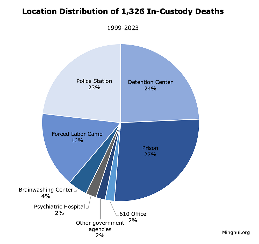 Među 3.531 (=3.370+161) smrtnih slučajeva uslijed mučenja ili prisilnog uzimanja droga, 1.326 se dogodilo dok su praktikanti još bili u pritvoru, uključujući 1.287 slučajeva kao rezultat mučenja i 39 slučajeva prisilnog uzimanja droga. Od 1326 smrti u pritvoru, 358 se dogodilo u zatvorima, 322 u pritvorskim centrima, 307 u policijskim postajama, 207 u logorima za prisilni rad, 53 u centrima za ispiranje mozga, 29 u psihijatrijskim bolnicama, 25 u Uredu 610 i još 25 u drugim vladinim agencijama. Neki praktikanti su pretučeni na smrt, satima ili danima nakon uhićenja. Zabilježeni su i ekstremni slučajevi u kojima su praktikanti kremirani živi.