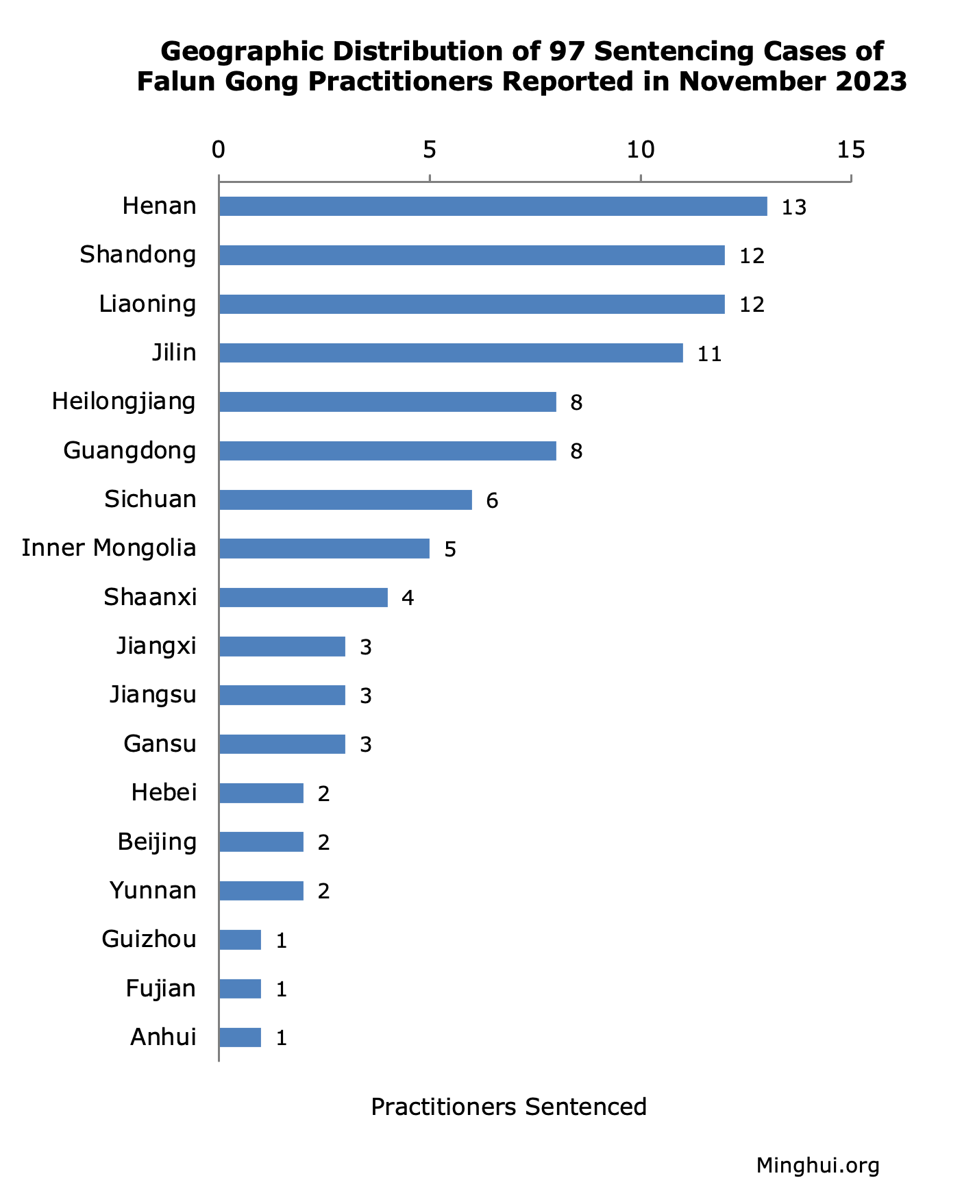 Mjesec studeni 2023. bilježi 97 prijavljenih slučajeva progona Falun Gong praktikanata koji su osuđeni za zatvor zbog ustrajavanja u vjeri.