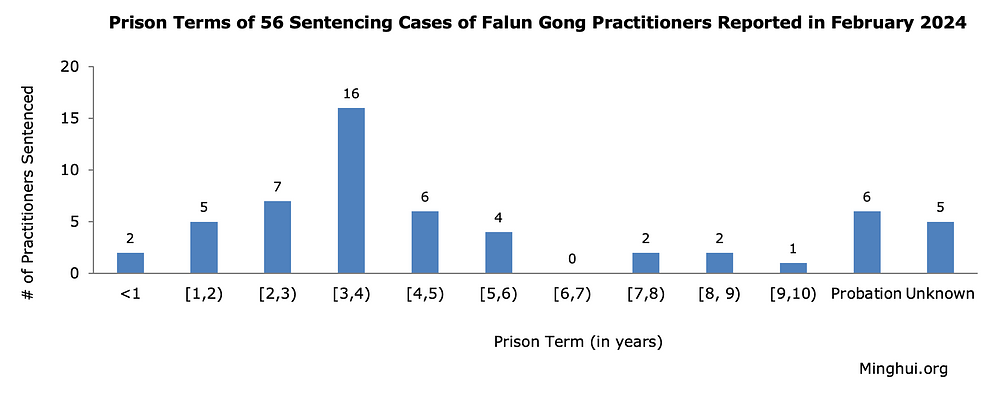U februaru 2024., prijavljeno je ukupno 56 slučajeva kineskih državljana koji su poštovali zakon, a osuđeni su zbog vere u Falun Gong.