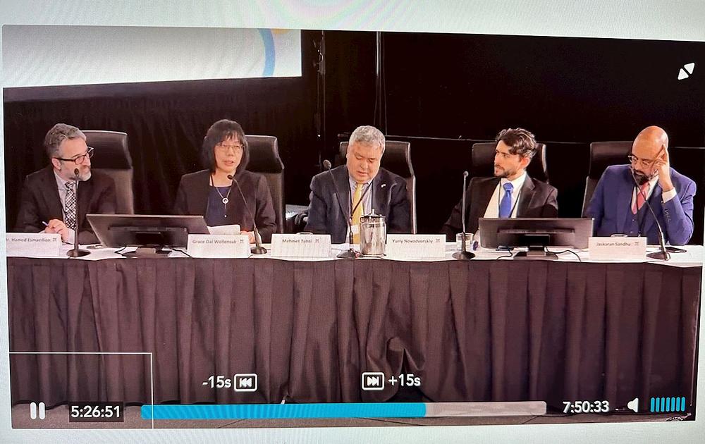 Video snimak saslušanja tijekom javne istrage o uplitanju stranih država u Ottawi održanom 27. ožujka 2024. Gđa Dai (druga lijevo), predsjednica Falun Dafa udruge u Kanadi, i Mehmet Tohti ( u sredini ), izvršni direktor Uyghur Rights Advocacy Project (URAP), svjedočio je o uplitanju KPK u Kanadu tijekom saslušanja.