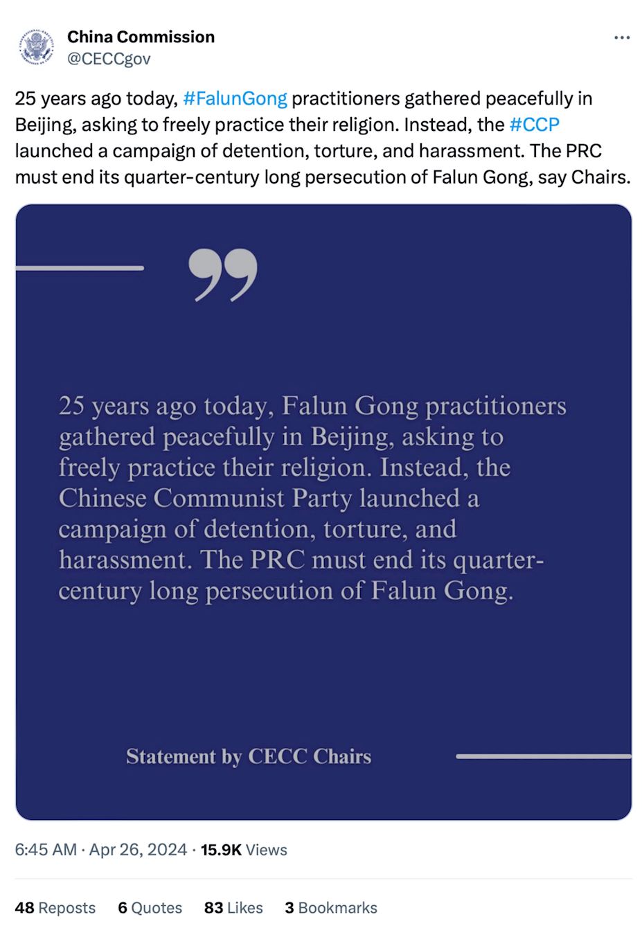 Kongresna-izvršna komisija za Kinu (CECC) je 25. aprila 2024. godine objavila saopštenje povodom obilježavanja 25 godišnjice apela održanog 25. aprila 1999. godine i pozvala je Komunističku partiju Kine (CCP) da okonča progon Falun Gonga.