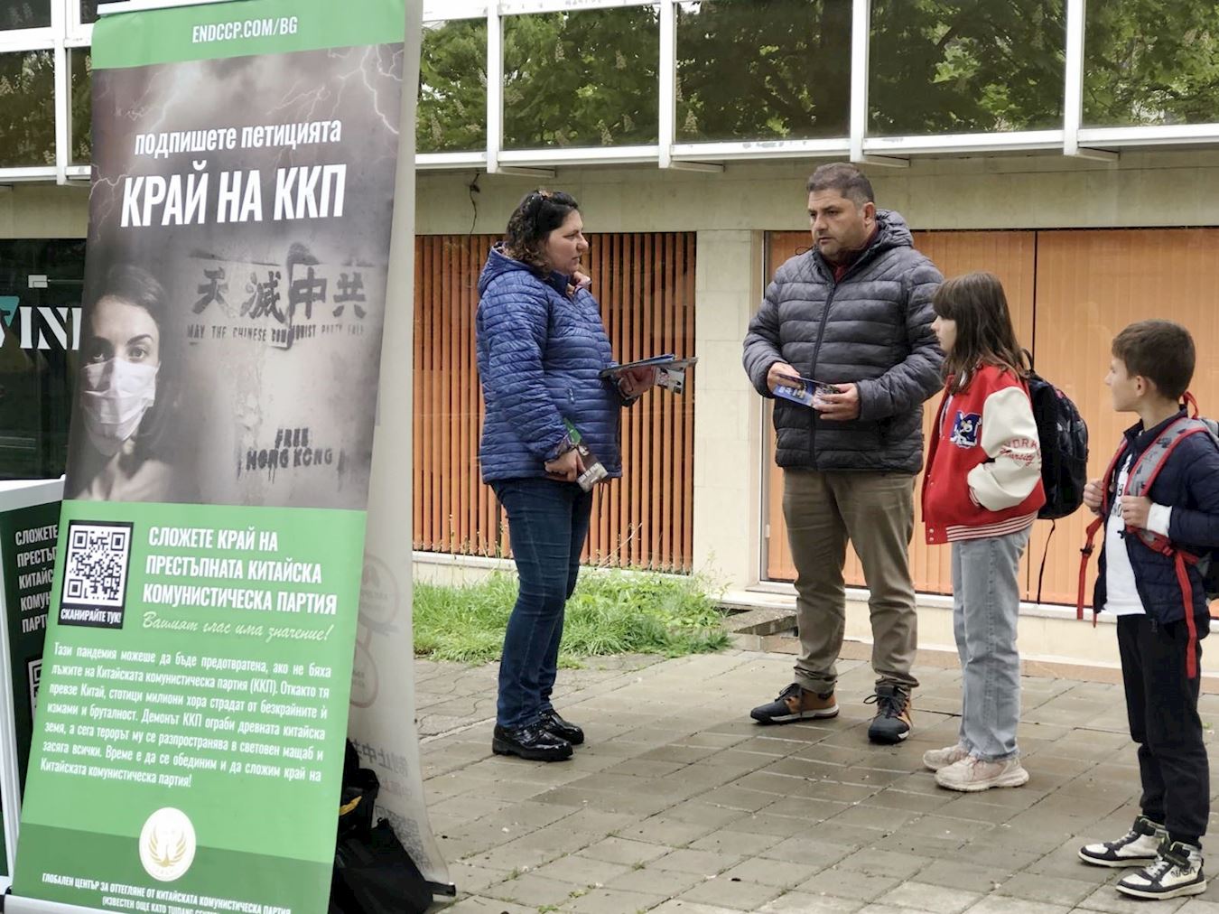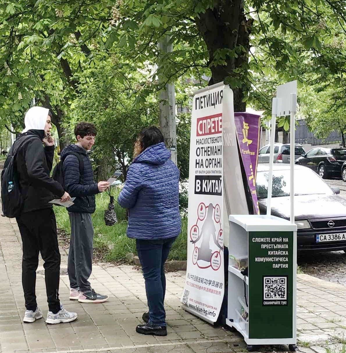 Praktikanti su duž pločnika nasuprot veleposlanstva postavili informativne materijale i transparente s natpisima na kineskom, engleskom i bugarskom: “Zaustavite prisilno uzimanje organa od živih ljudi”, “Falun Dafa je dobar” i “Istinitost, Dobrodušnost, Tolerancija.”