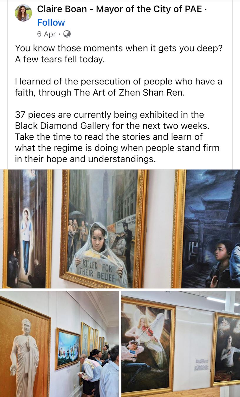 Gđa Boan je nastavila dijeliti svoja razmišljanja o izložbi putem objave na društvenim mrežama: “Znate one trenutke kada vas to duboko pogodi? Danas je palo nekoliko suza. Saznala sam za progon ljudi koji imaju vjeru kroz Izložbu Zhen Shan Ren.” Potaknula je ljude da pogledaju izložbu kako bi razumjeli "što režim radi kada ljudi čvrsto stoje u svojoj nadi i razumijevanju."