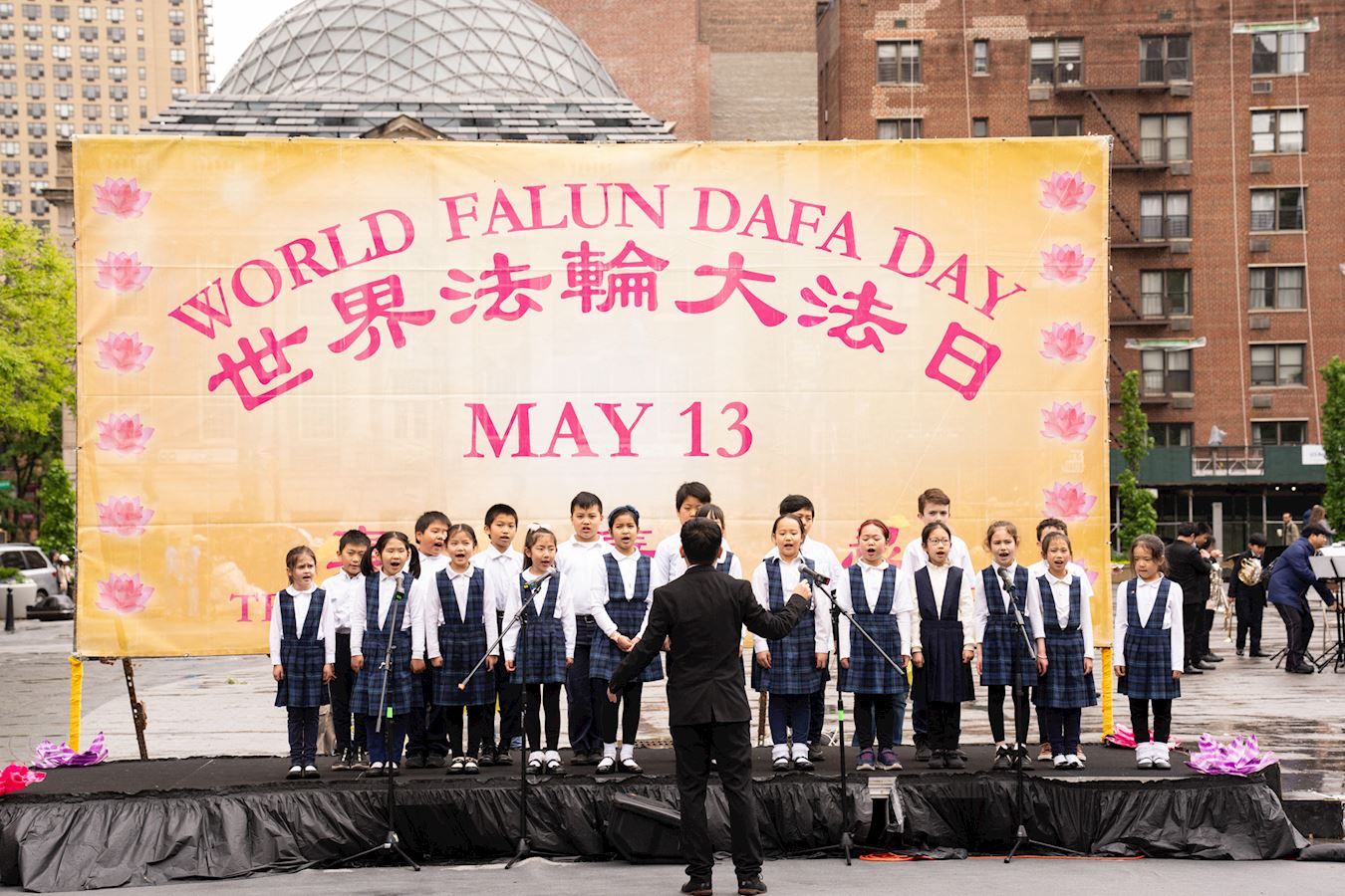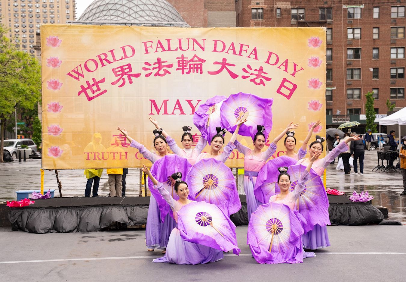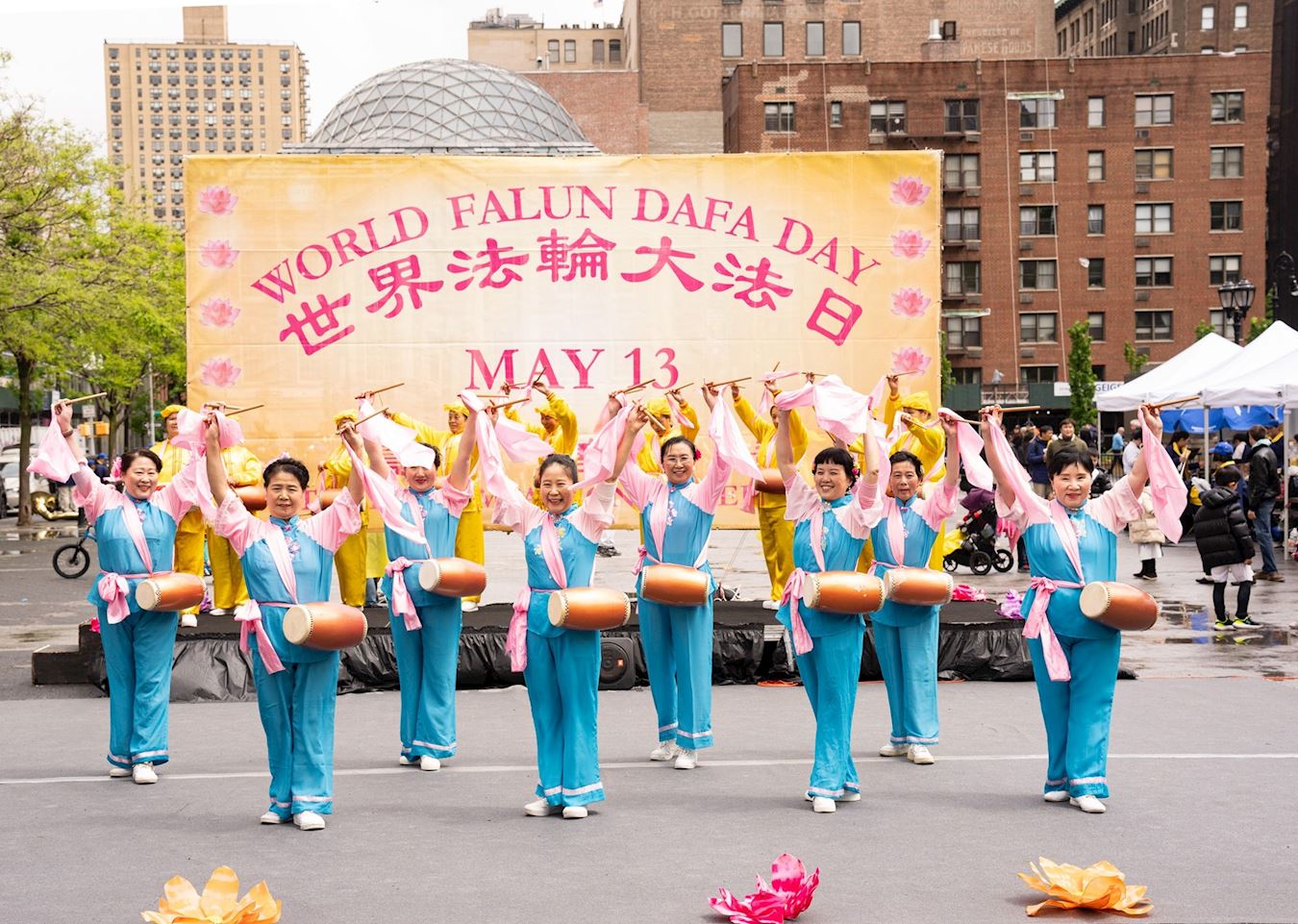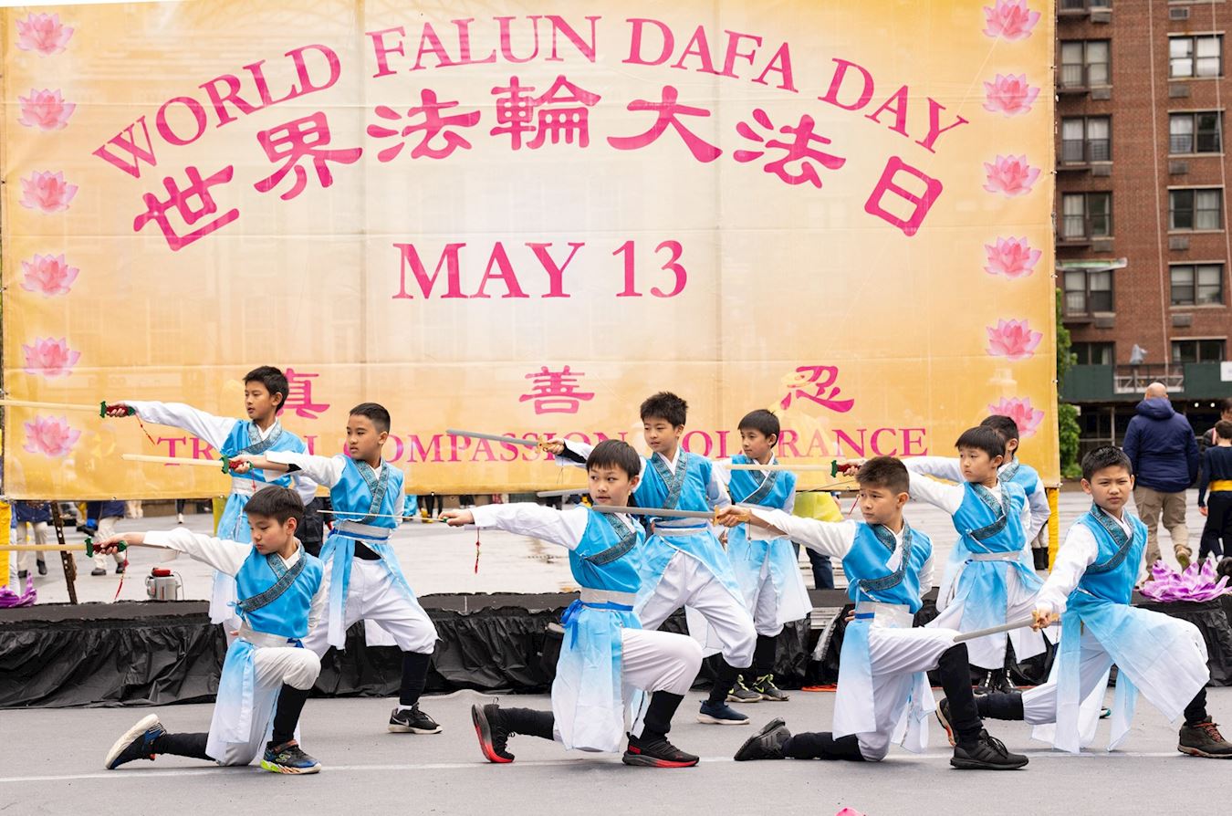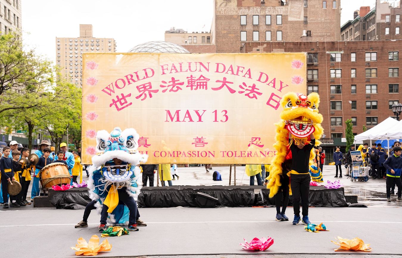 Praktikanti iz New Yorka donijeli su glazbu i ples na Union Square, Manhattan, 12. svibnja kako bi proslavili 32. godišnjicu predstavljanja Falun Dafa svijetu i 25. Svjetski dan Falun Dafa. Budući da su imali koristi od Falun Dafa fizički i duhovno, također su iskreno zaželjeli sretan rođendan svom osnivaču, Učitelju Li-ju.