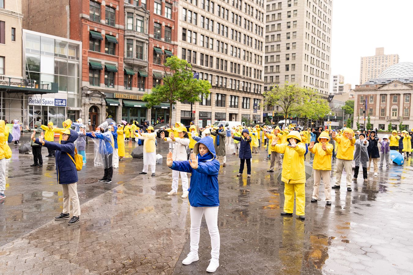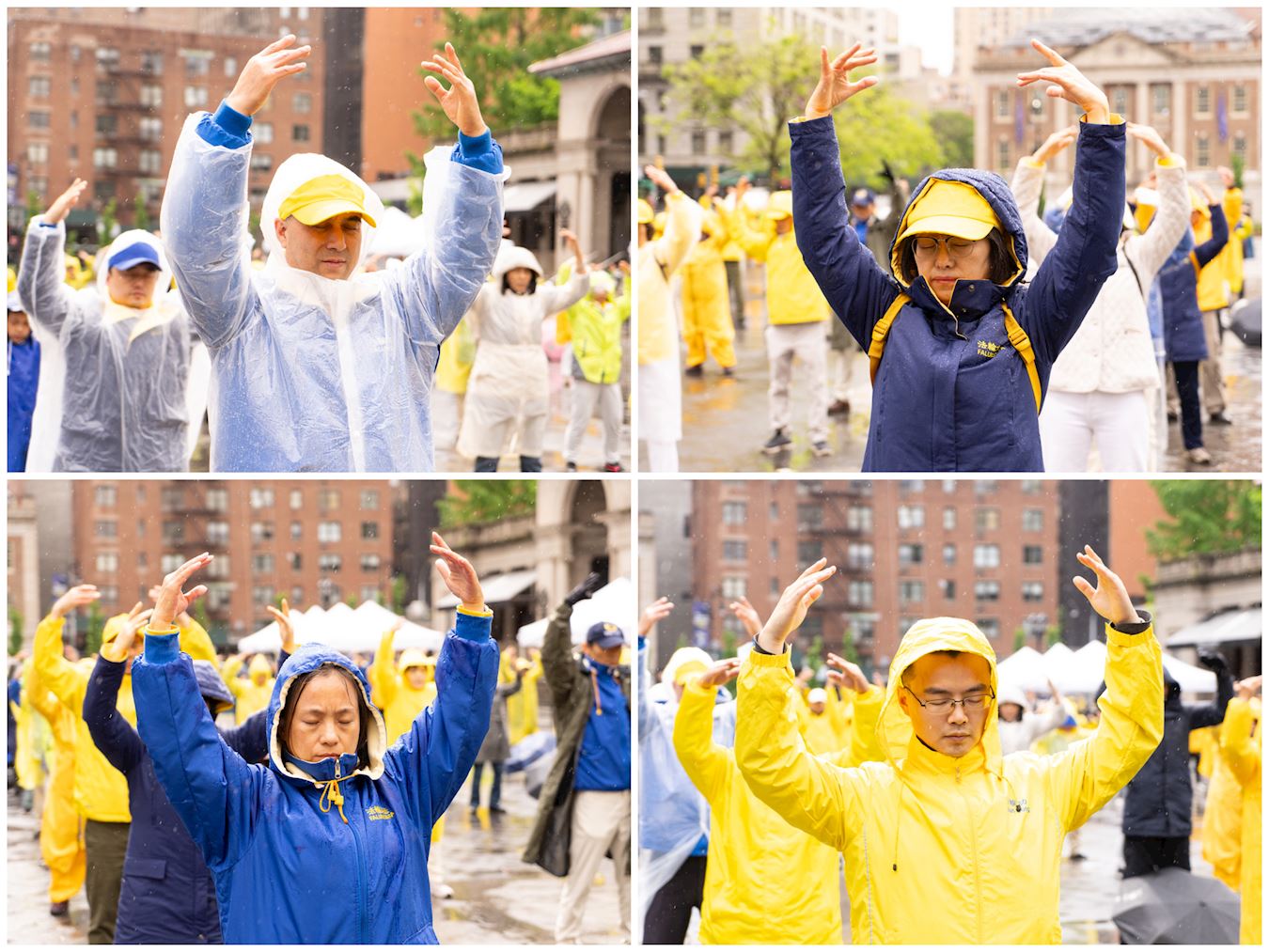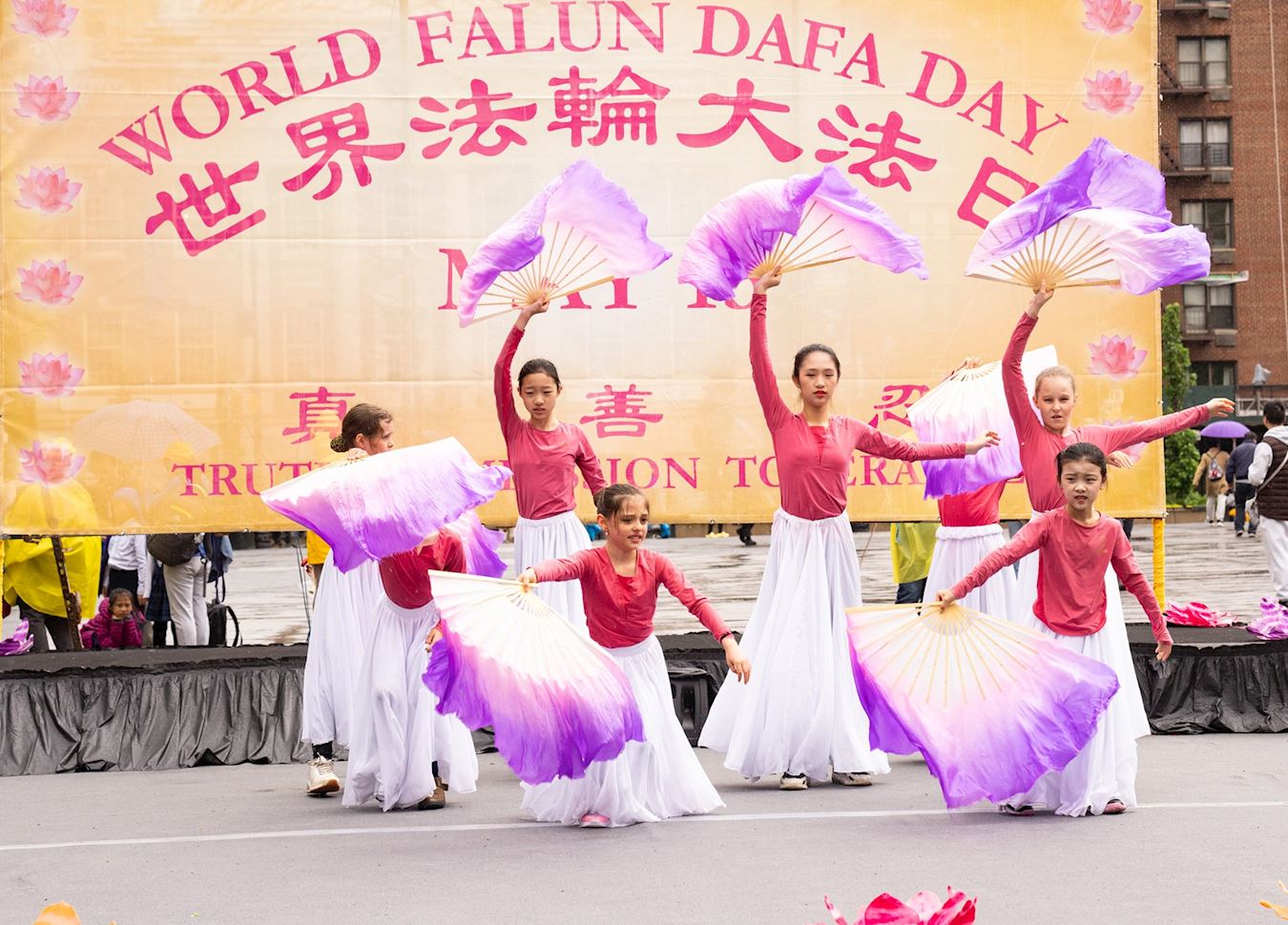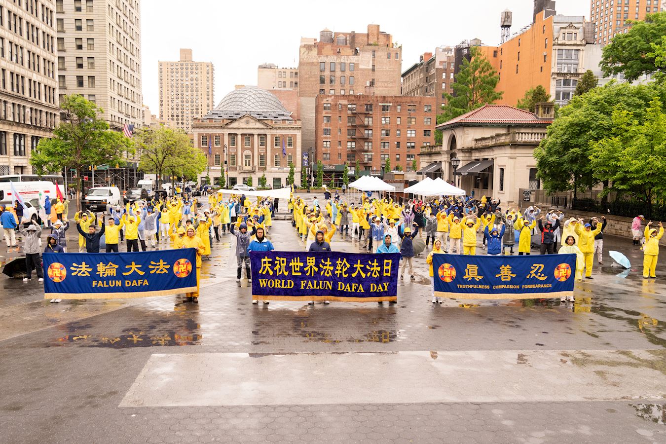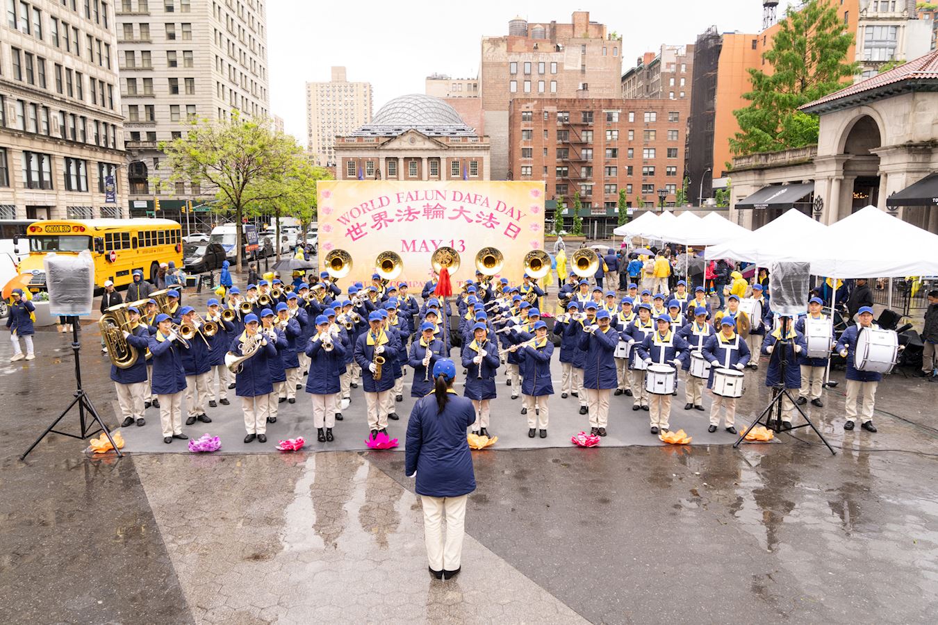 Praktikanti iz New Yorka donijeli su glazbu i ples na Union Square, Manhattan, 12. svibnja kako bi proslavili 32. godišnjicu predstavljanja Falun Dafa svijetu i 25. Svjetski dan Falun Dafa. Budući da su imali koristi od Falun Dafa fizički i duhovno, također su iskreno zaželjeli sretan rođendan svom osnivaču, Učitelju Li-ju.