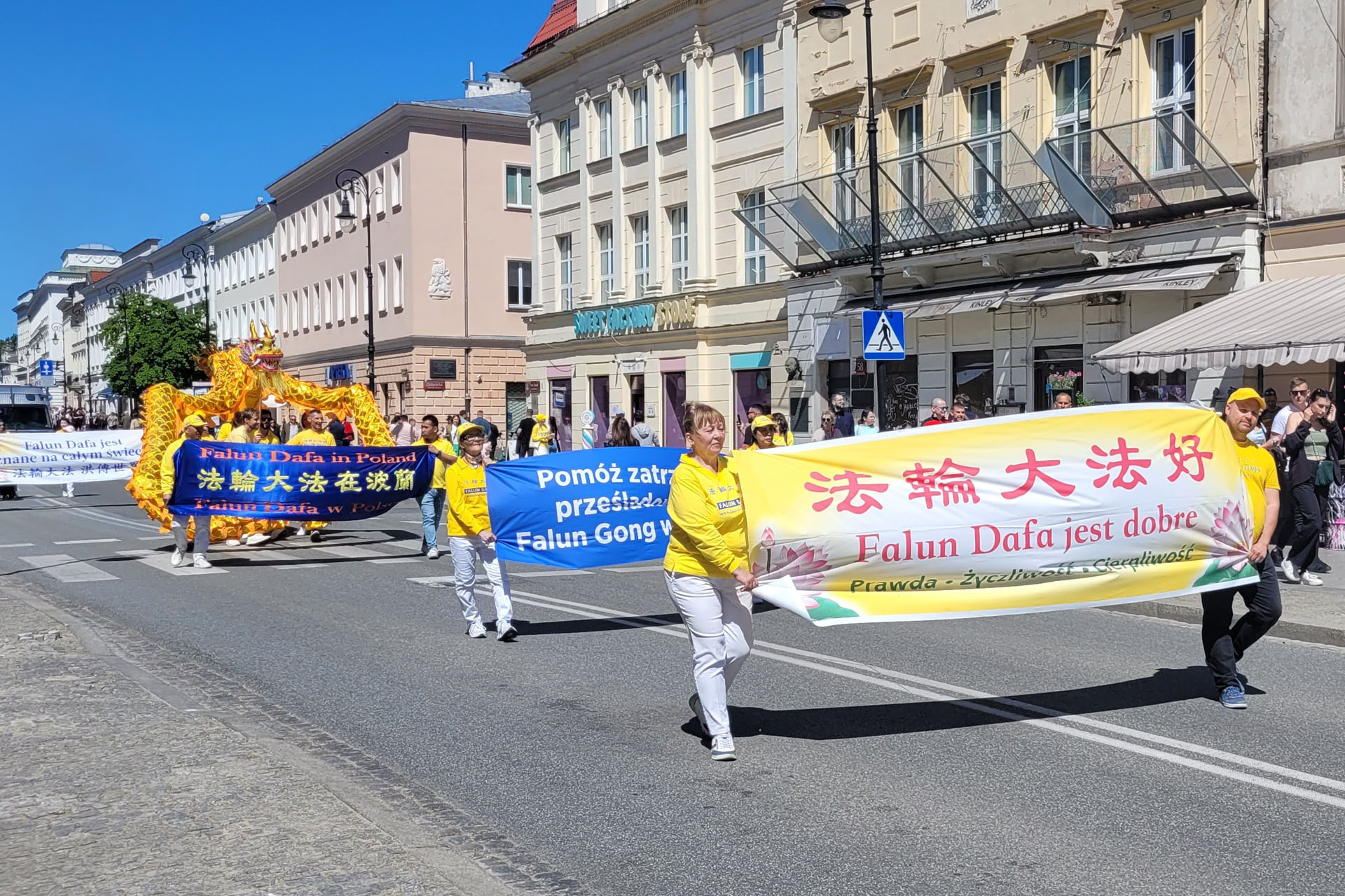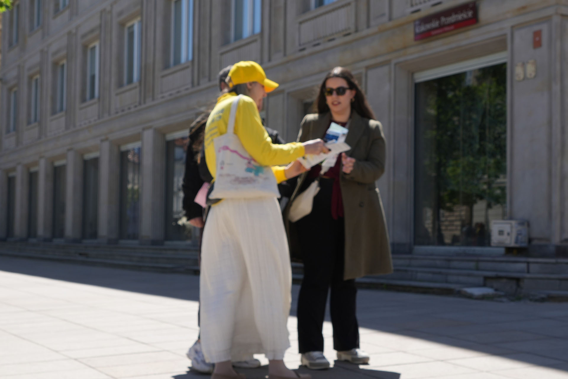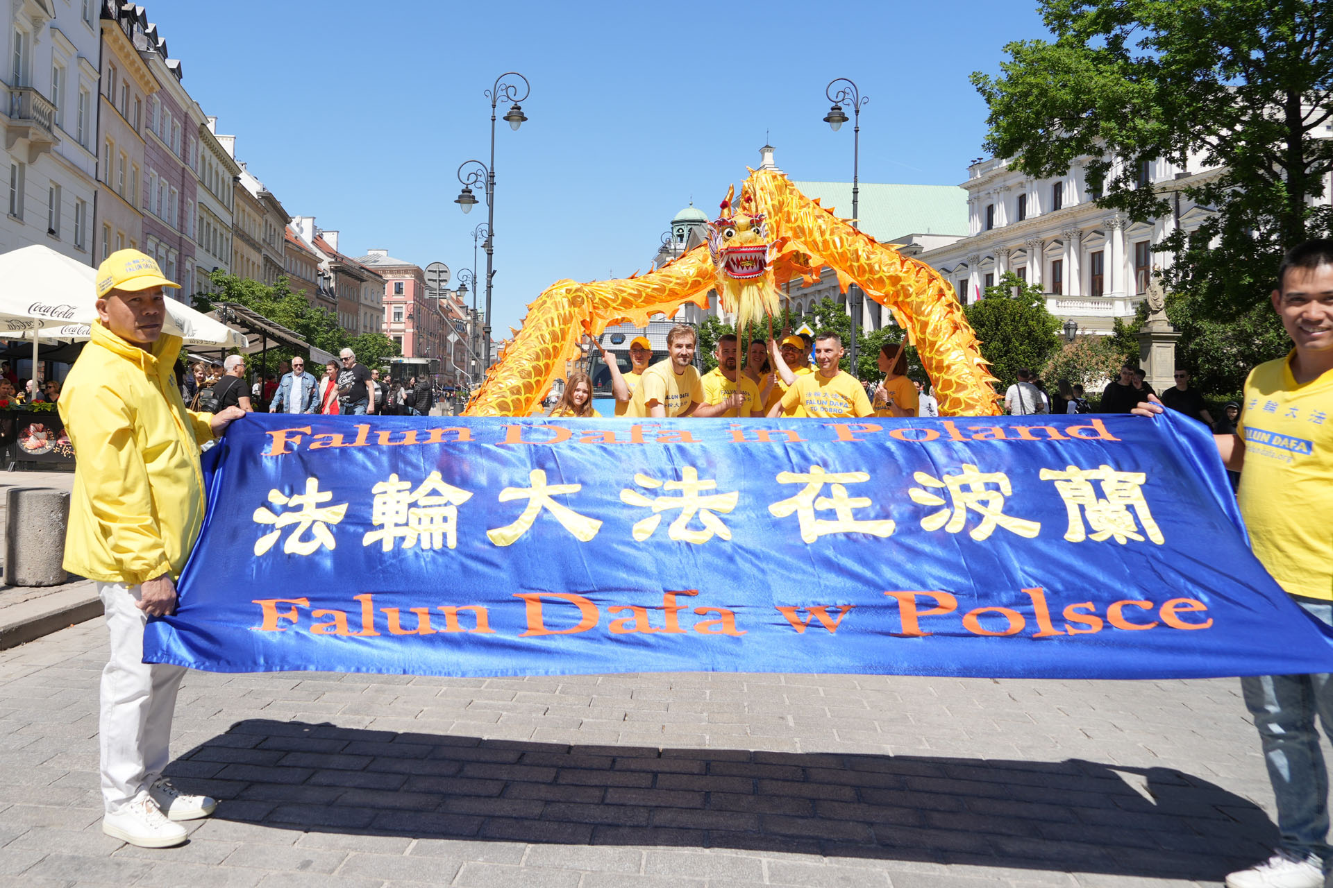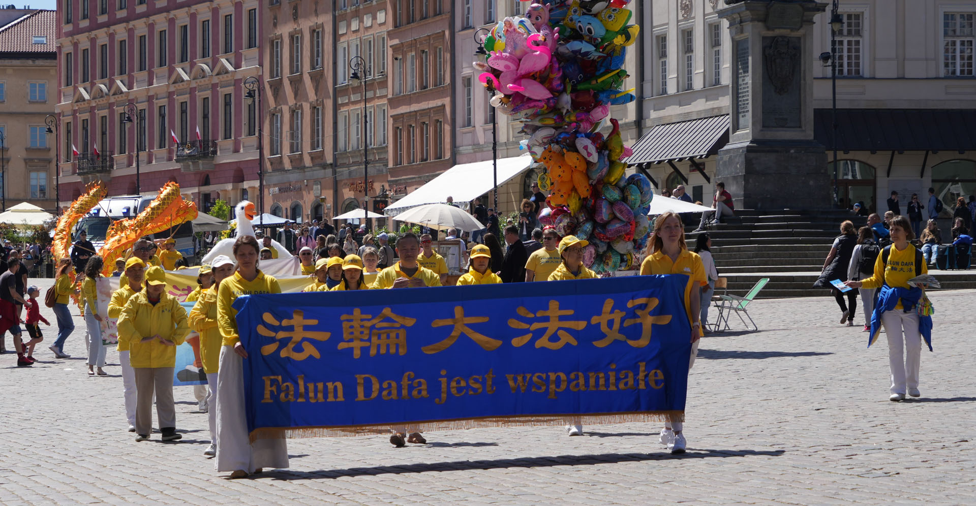 Praktikanti su u Poljskoj, 12. maja 2024., održali ktivnosti na Starom gradskom trgu u Varšavi kako bi proslavili 32. godišnjicu predstavljanja Falun Dafa javnost, koja je ujedno i Svjetski dan Falun Dafa.